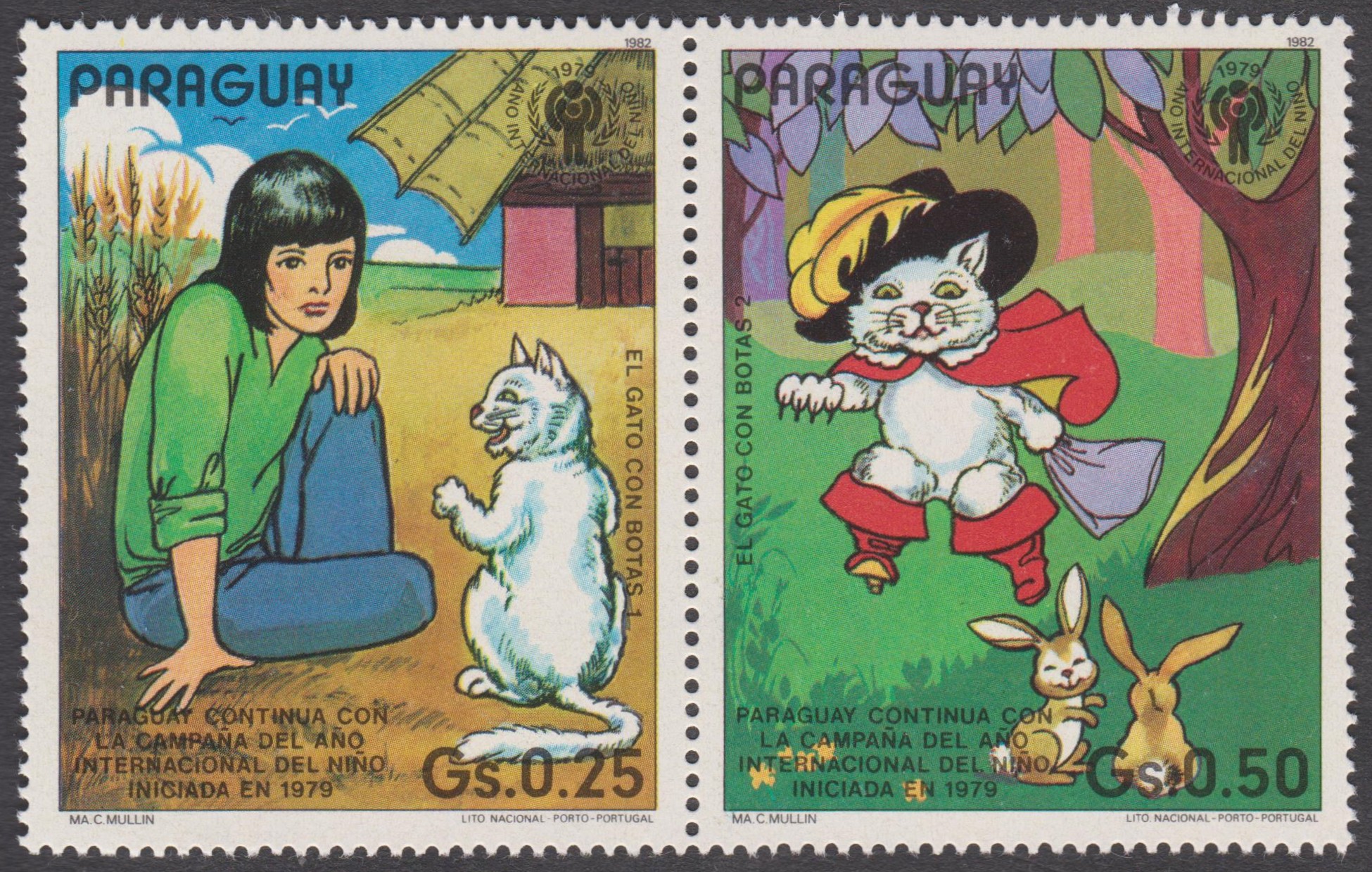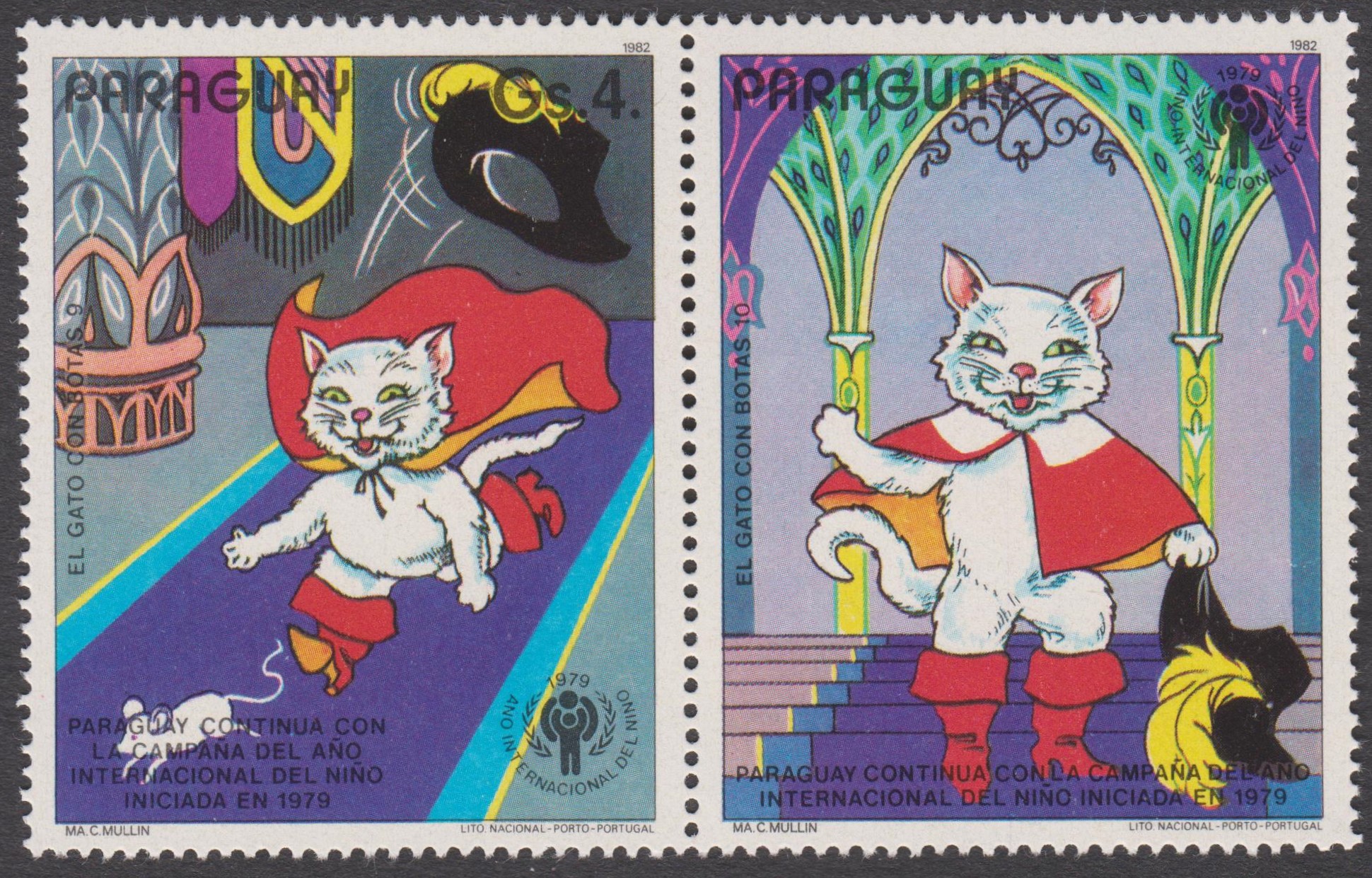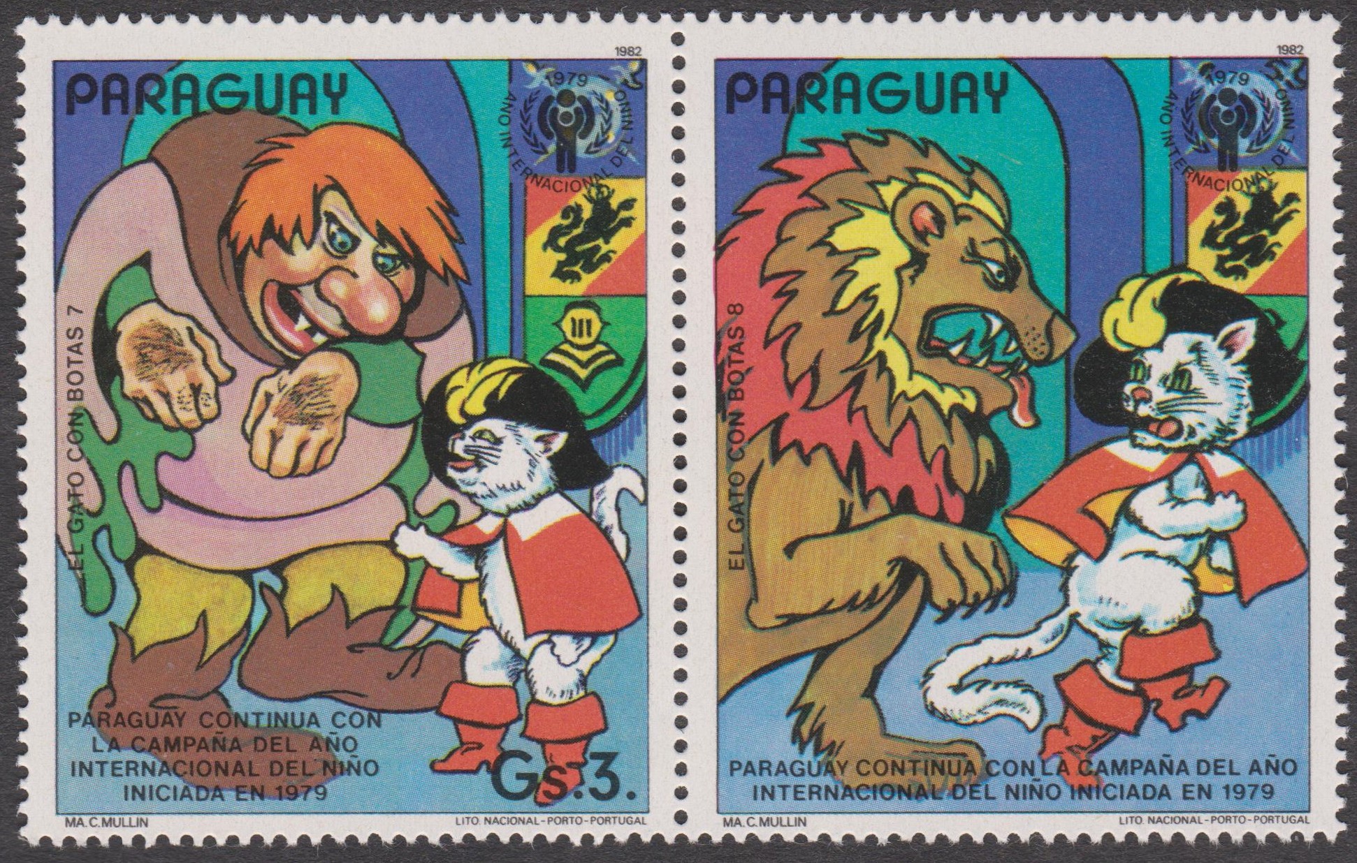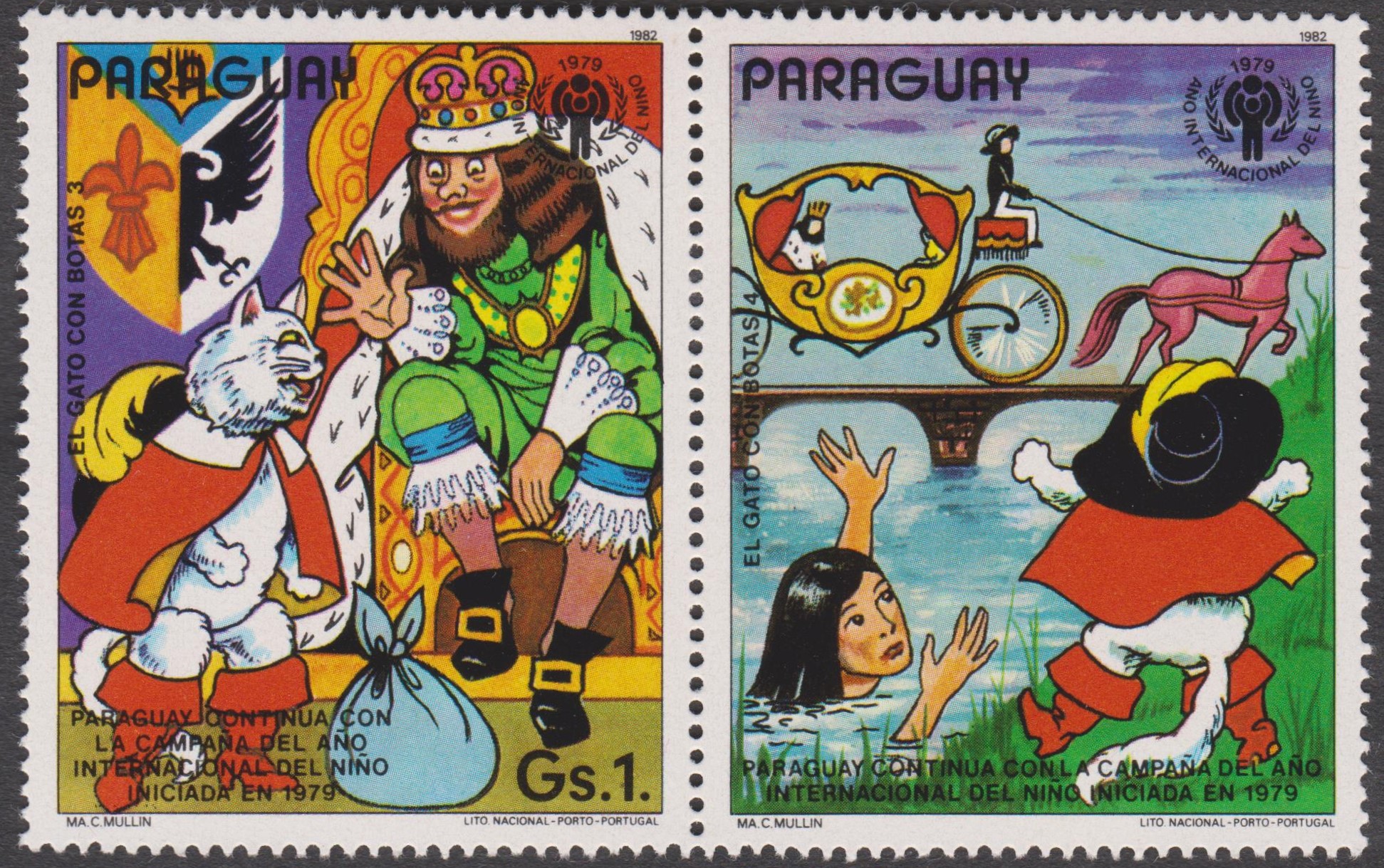 Diese Postwertzeichen aus Paraguay zeigen Szenen aus dem Märchen "Der gestiefelte Kater":
