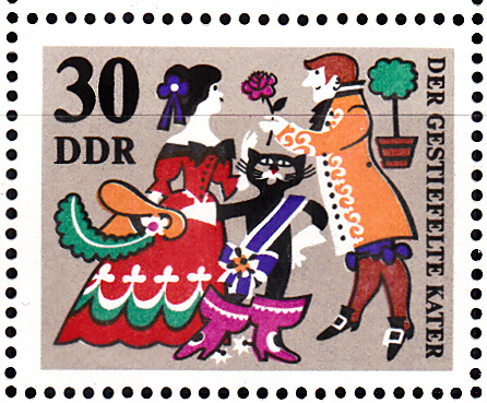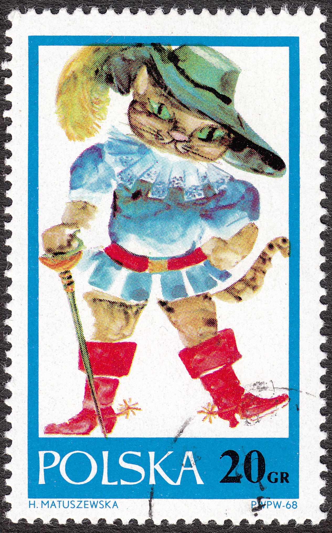 Hier ein Postwertzeichen aus Polen mit der Darstellung einer Zeichnung, die den gestiefelten Kater zeigt: