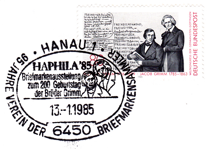 Sonderstempel aus Hanau vom 13.1.1985 zu einer Briefmarkenausstellung anläßlich des 200. Geburtstages der Brüder Grimm. Passend zum Thema wurde auch hier die Sondermarke "200. Geburtstag der Brüder Grimm" der Deutschen Bundespost (MiNr 1236) auf dem Umschlag verklebt.