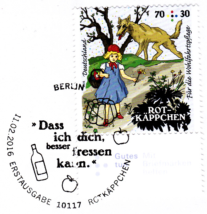 Im Ersttagsonderstempel aus Berlin zu dieser Markenserie ist die Antwort des Wolfes auf Rotkäppchens Frage "Dass ich dich besser fressen kann" zu finden.