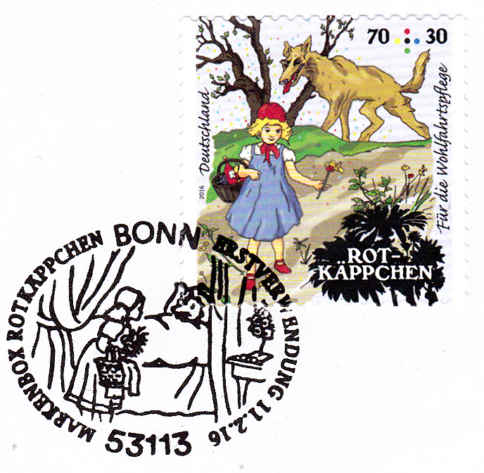 Für die selbstklebende Marke aus dem Markenset (MiNr 3215 aus MH 103) wurde dieser "Erstverwendungsstempel" Bonn am 11.2.2016 eingesetzt. Im Stempel begegnet Rotkäppchen dem Wolf im Wald, passend zum Markenbild.