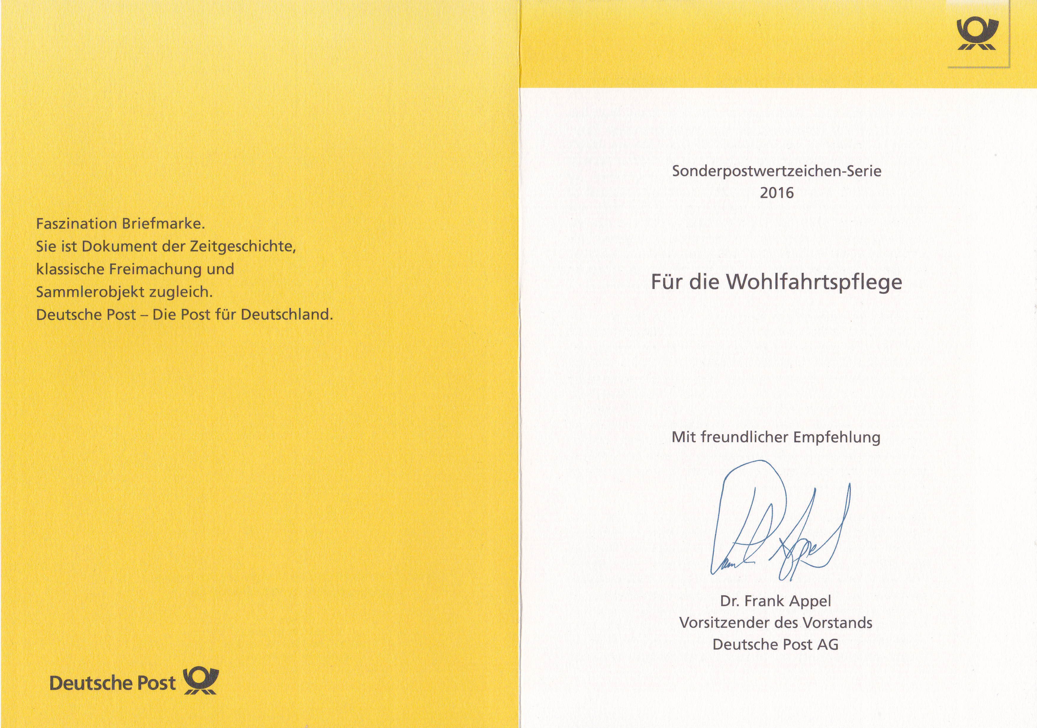 In der Klappkarte des Vorsitzenden der Deutschen Post AG wird nur der Bonner Ersttagsonderstempel verwendet.