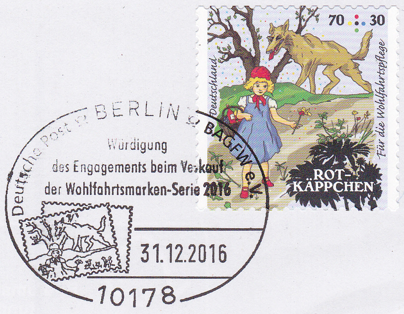 Sonderstempel vom 31.12.2016 aus Berlin zur "Würdigung des Engagement beim Verkauf der Wohlfahrtsmarkenserie 2016" mit einer Abbildung ähnlich der 70+30 Wohlfahrtsmarke mit Rotkäppchen und dem Wolf im Stempelbild.