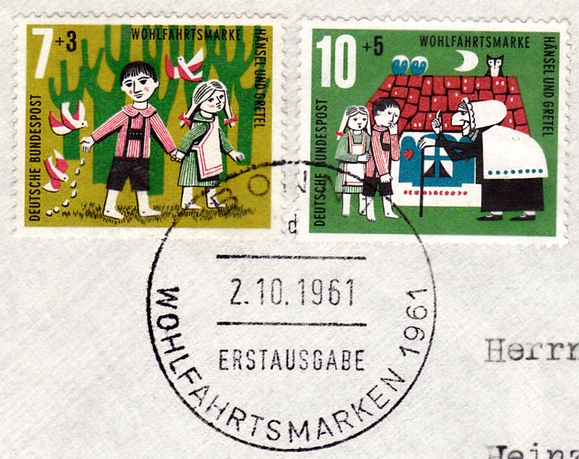 Der Markenschöpfer Werner Klemke hat auf dem Kleinbogenrand zwei Randelemente dazu genutzt, um "Hänsel und Gretel" sowie die zielführende Märchengestalt der Hexe unter zu bringen. Neben der Hexe erscheint schemenhaft der Klemke'sche Kater. ;)