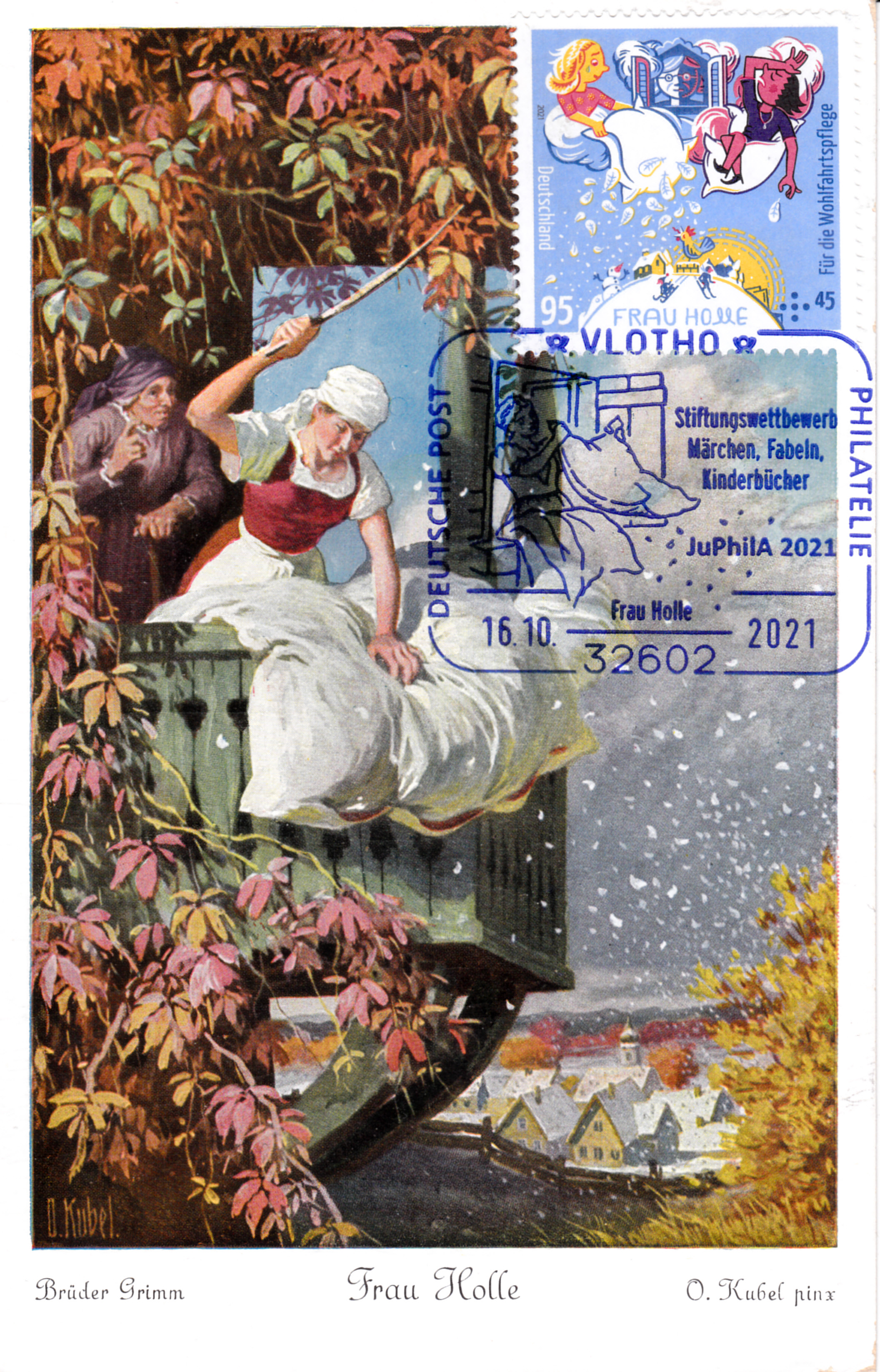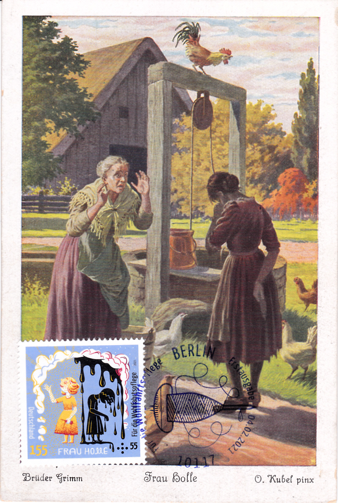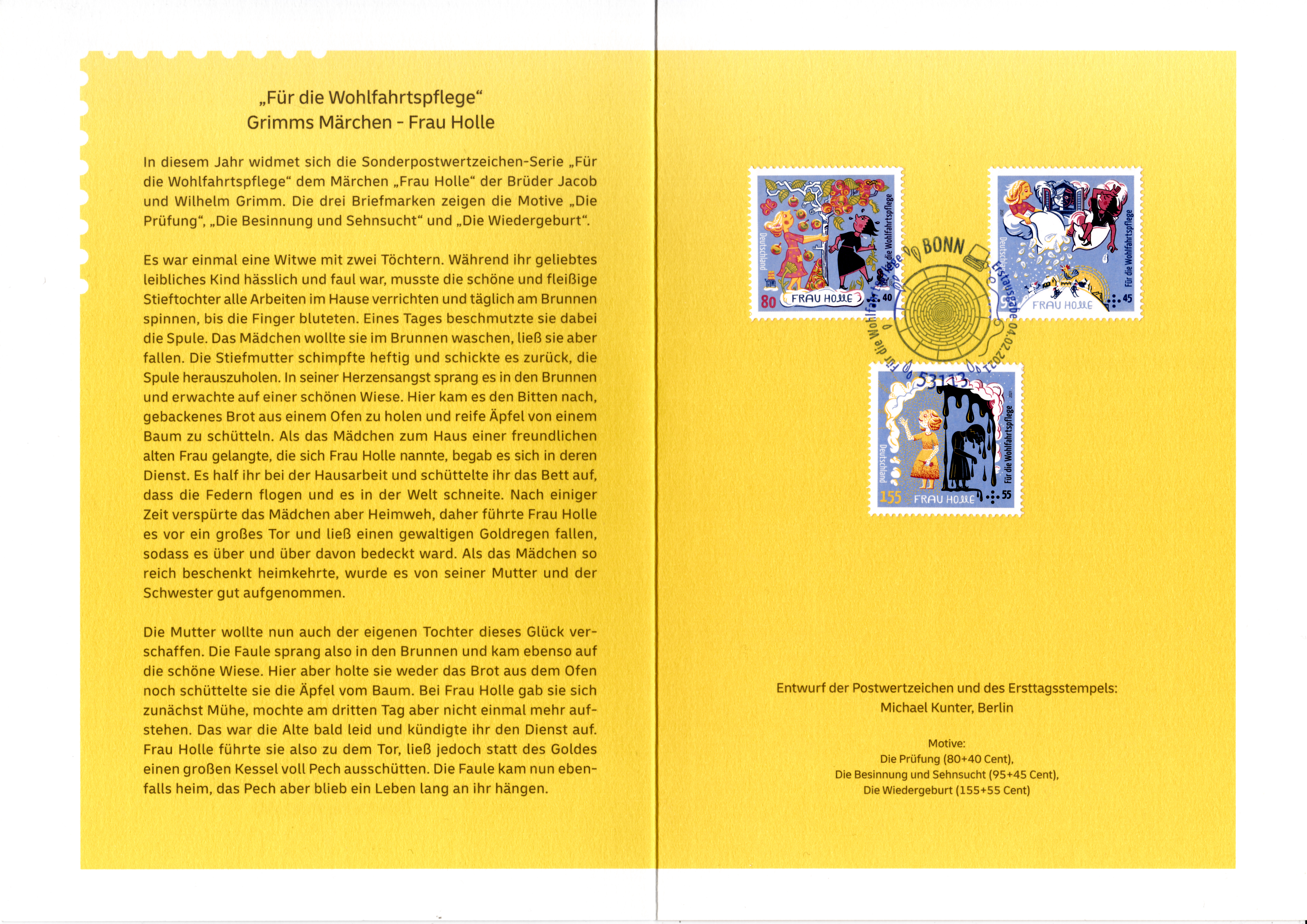 Farbige Ministerkarte des Finanzministers mit je einer Marken der Wohlfahrtsmarkenserie 2021 (MiNr 3585 bis 3587) mit Motiven zum Thema "Frau Holle". Zwei Marken sind mit den Ersttagsonderstempel Berlin gestempelt und eine Marke erhielt den Ersttagsonderstempel Bonn.