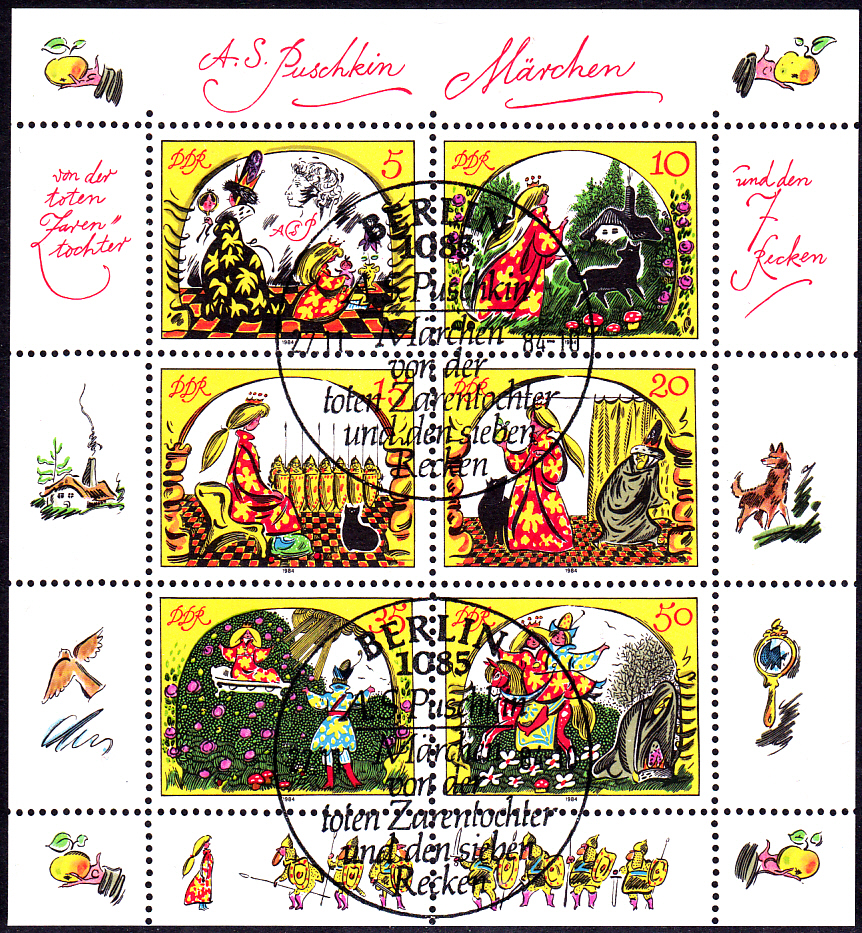 Der von Rüdiger gezeigte Kleinbogen mit dem "Märchen von der toten Zarentochter und den 7 Recken" gibt es in einer selteneren Version auch oben nicht durchgezähnt. Hier zeige ich ein Exemplar mit Ersttagsonderstempel.