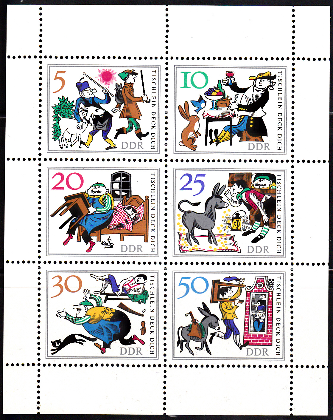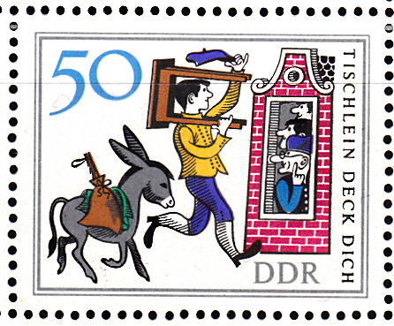 Auf der letzten Marke aus dem Bogen der DDR sehen wir die Ankunft des jüngsten Sohnes mit dem Tischlein, dem Esel und dem Knüppel aus dem Sack.