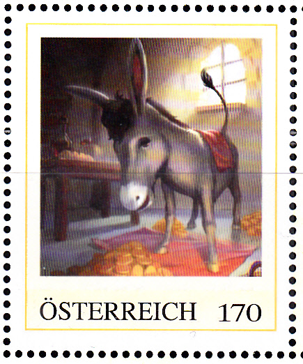 Diese Marke aus Österreich gehört zwar zu den "Marken auf Privatbestellung" wurde aber von der Post selbst in einem Buch mit dem Titel "Ausgewählte Märchen der Gebrüder Grimm" verkauft. Die Marke zeigt den Esel und die ausgespuckten Goldstücke.