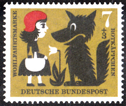 Der 10 + 5 Pfennigwert der Serie (MiNr 341) zeigt Rotkäppchen am Bett der Großmutter.