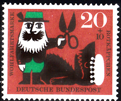 Er füllt dem Wolf stattdessen Steine in den Bauch. Wegen des Gewichts der Steine kann der Wolf nicht fliehen und stirbt. Großmutter und Rotkäppchen sind wohlauf und erfreuen sich an den mitgebrachten Gaben, wie wir auf der Marke zu 40 + 20 Pfennig (MiNr 343) sehen.