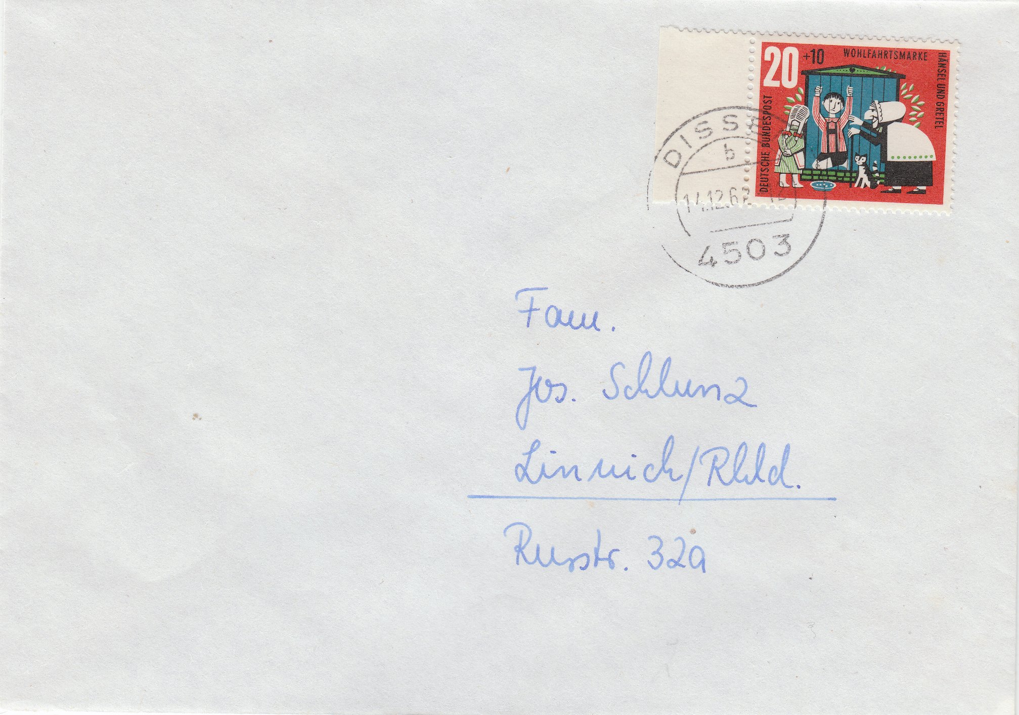 Hänsel und Gretel sind die Kinder eines armen Holzfällers, der mit seiner Frau im Wald lebt. Als die Not zu groß wird, überredet sie ihren Mann, die beiden Kinder im Wald auszusetzen. Der Holzfäller führt die beiden am nächsten Tag in den Wald. Doch Hänsel hat die Eltern belauscht und legt eine Spur aus kleinen weißen Steinen, anhand derer die Kinder zurückfinden. So kommt es, dass der Plan der Mutter scheitert. Doch der zweite Versuch gelingt: Dieses Mal haben Hänsel und Gretel nur eine Scheibe Brot dabei, die Hänsel zerbröckelt, um eine Spur zu legen. Diese wird jedoch von Vögeln gefressen. Diese Szene ist auf der Jugendmarke zu 7+3 Pf der Deutschen Bundespost MiNr. 369 zu sehen, hier als portorichtige EF auf Standarddrucksache:
