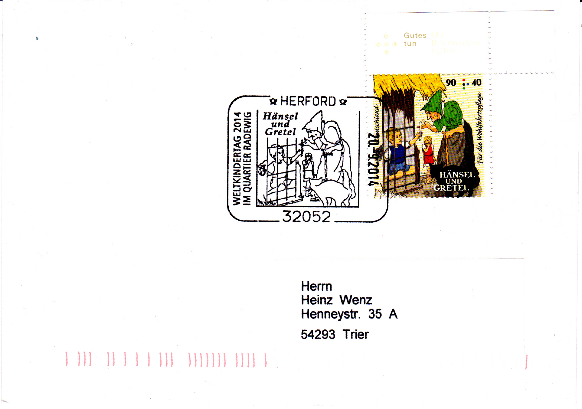 Zum Weltkindertag 2014 wurde am 20.9.2014 in Herford in einer Sonderpostfiliale ein Sonderstempel zum Motiv "Um zu überprüfen, ob der Junge schon dick genug ist, befühlt die halbblinde Hexe jeden Tag seinen Finger. Hänsel streckt ihr nun jedes Mal einen kleinen Knochen entgegen, um sie zu täuschen" geführt. Der Stempel ist bildgleich zur Wohlfahrtsmarke 2014 zu 90 + 40 Cent (MiNr 3057), die hier auch als Frankatur benutzt wurde.