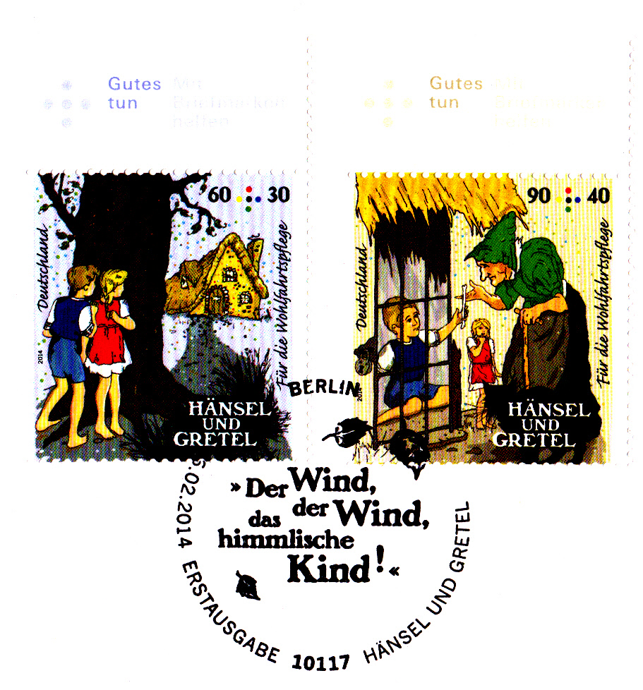 Hier die Werte zu 60 + 30 Cent (Hänsel und Gretel entdecken im Wald das Haus der Hexe, MiNr 3056) und 90 + 40 Cent (MiNr 3057). Im Ersttagssonderstempel aus Berlin wird die Antwort von Hänsel und Gretel auf die Frage der Hexe zitiert: "Der Wind, der Wind, das himmlische Kind!"