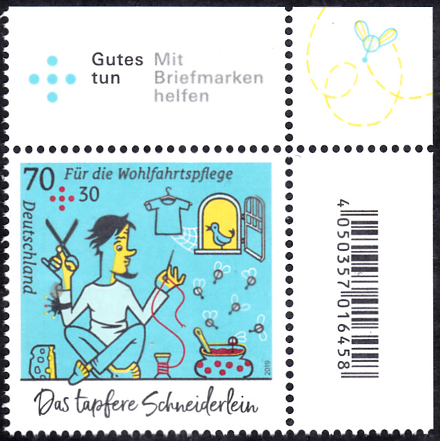 Die Wohlfahrtsmarken 2019 der Deutschen Post erschienen mit Motiven zum Märchen "Das tapfere Schneiderlein". Hier zunächst die Marke zu 70 + 30 Cent mit der Darstellung "In der Schneiderstube" als Eckrandstück mit EAN-Code: