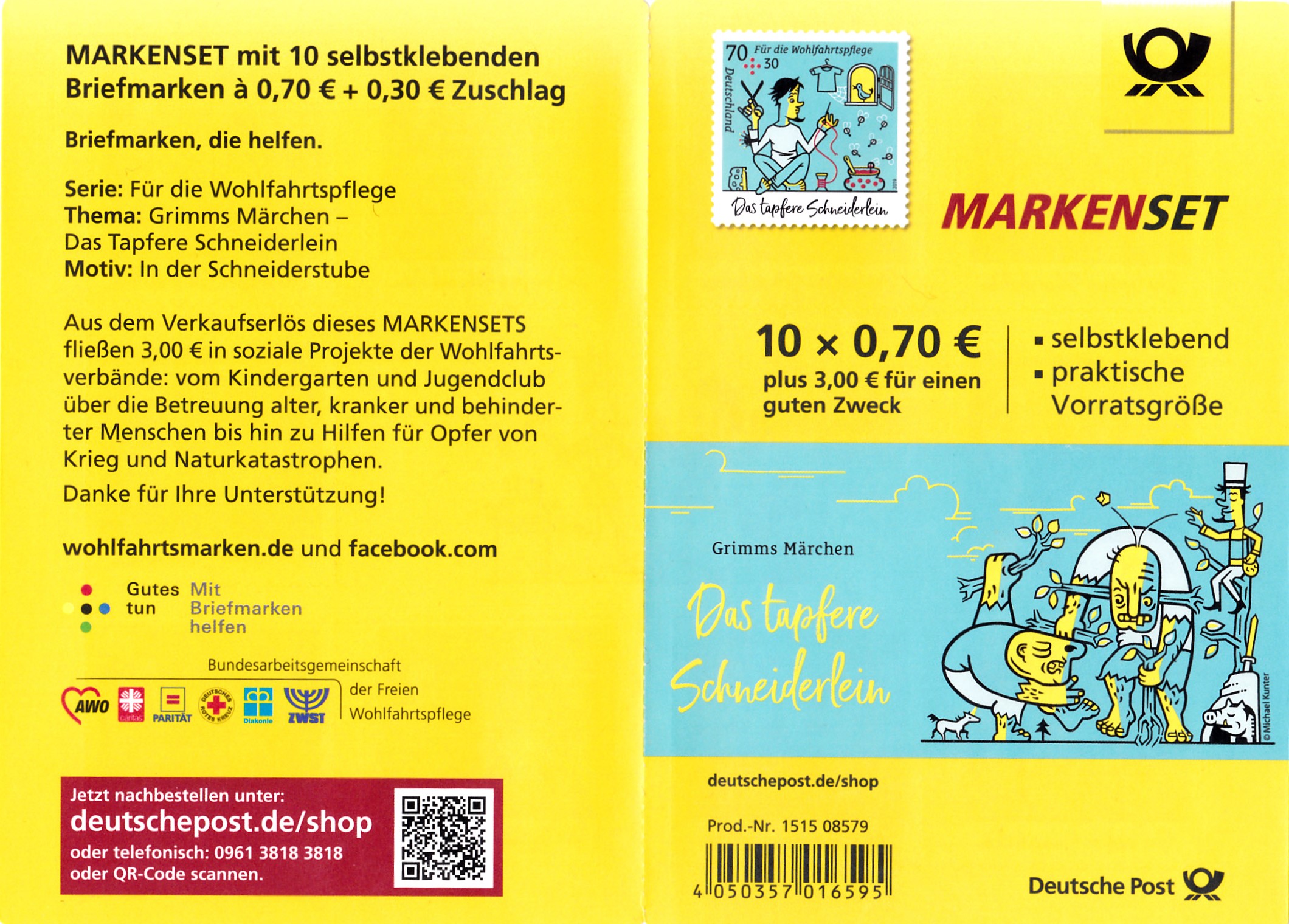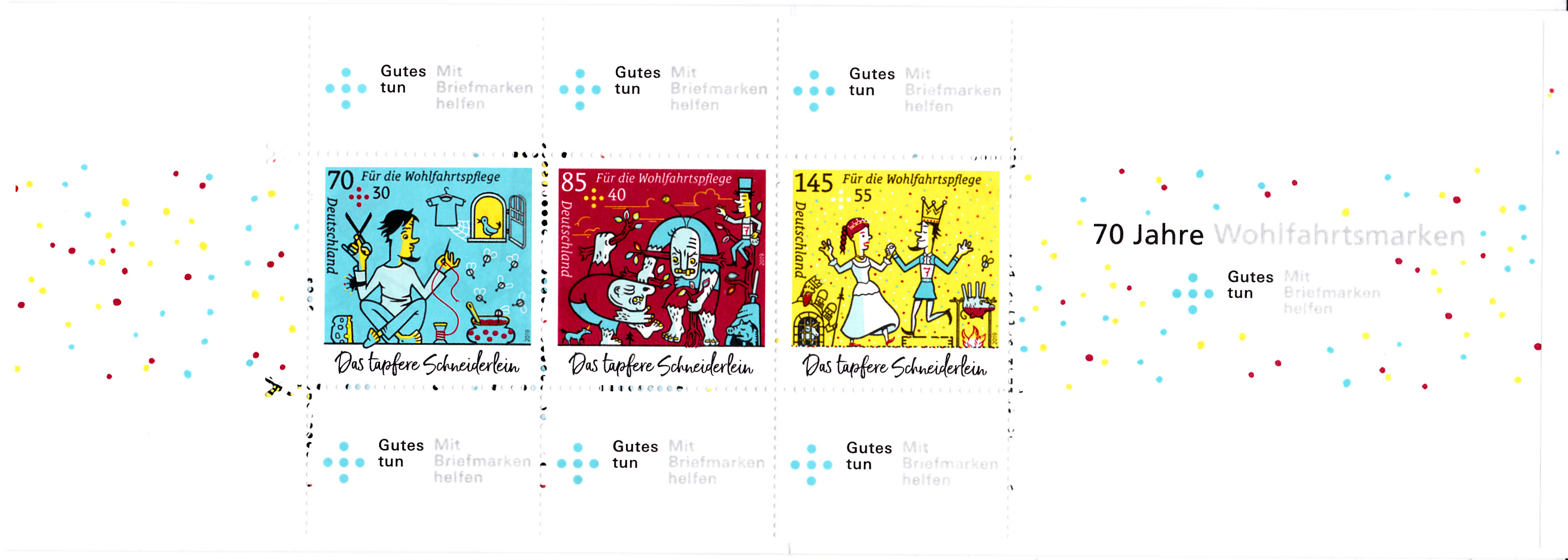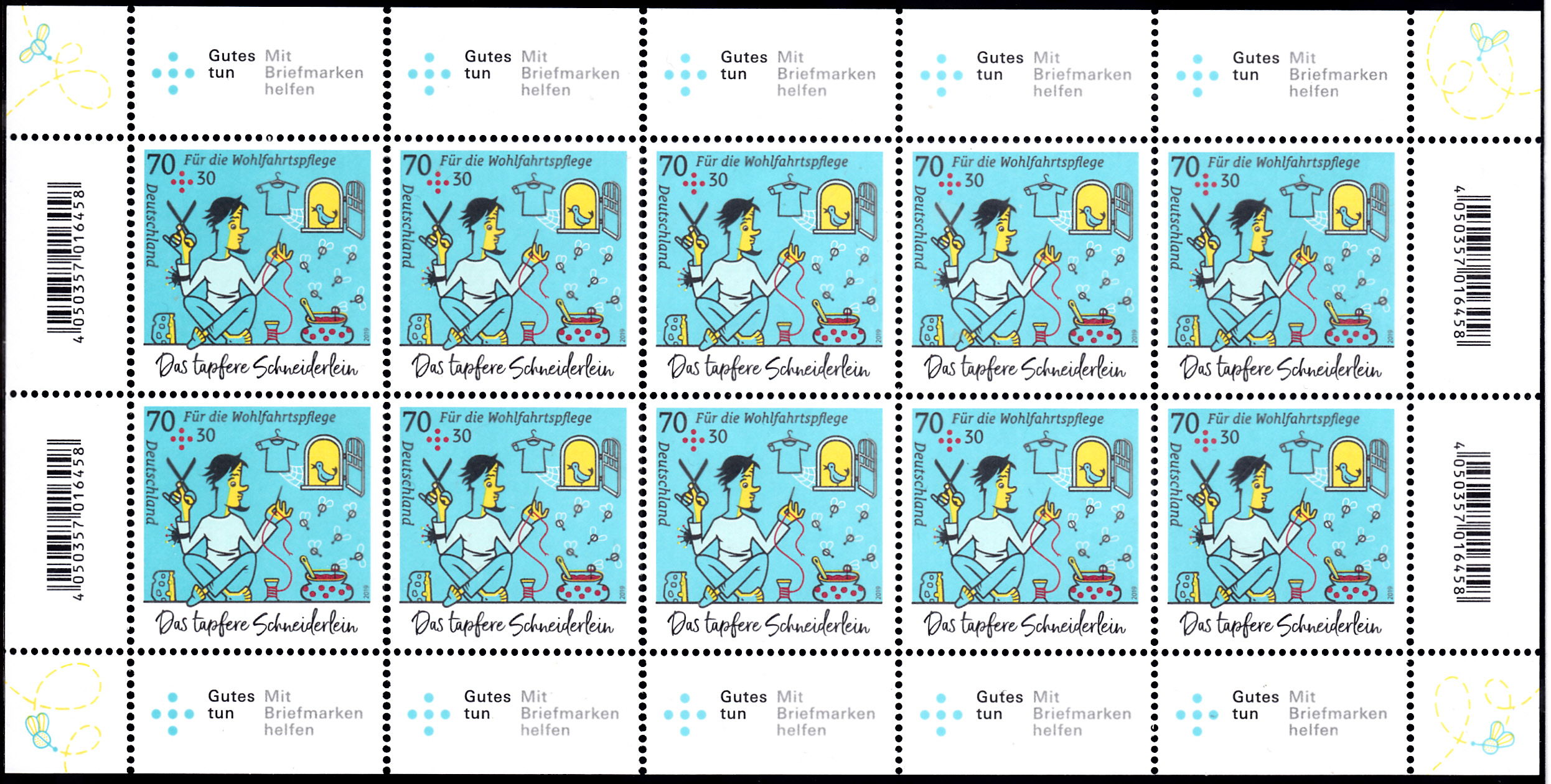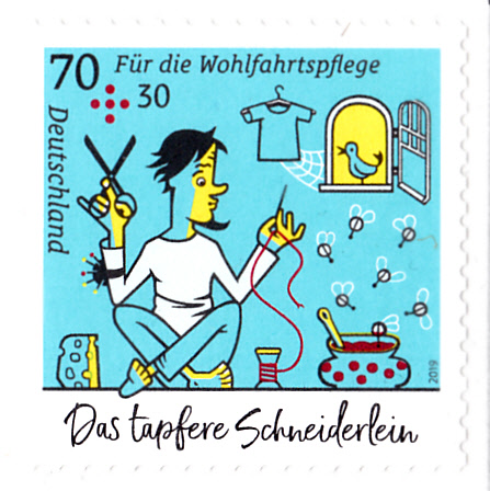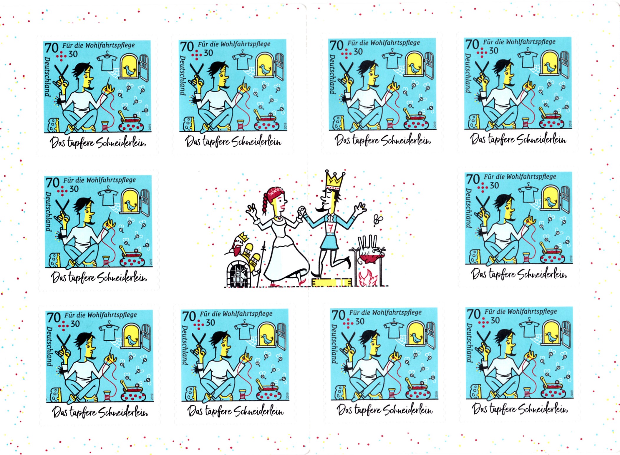 Zum 200. Geburtstag der Brüder Grimm ist in einem Kleinbogen auch eine Marke (MiNr 2988) mit einer Darstellung zu dem Märchen "Das tapfere Schneiderlein" erschienen.