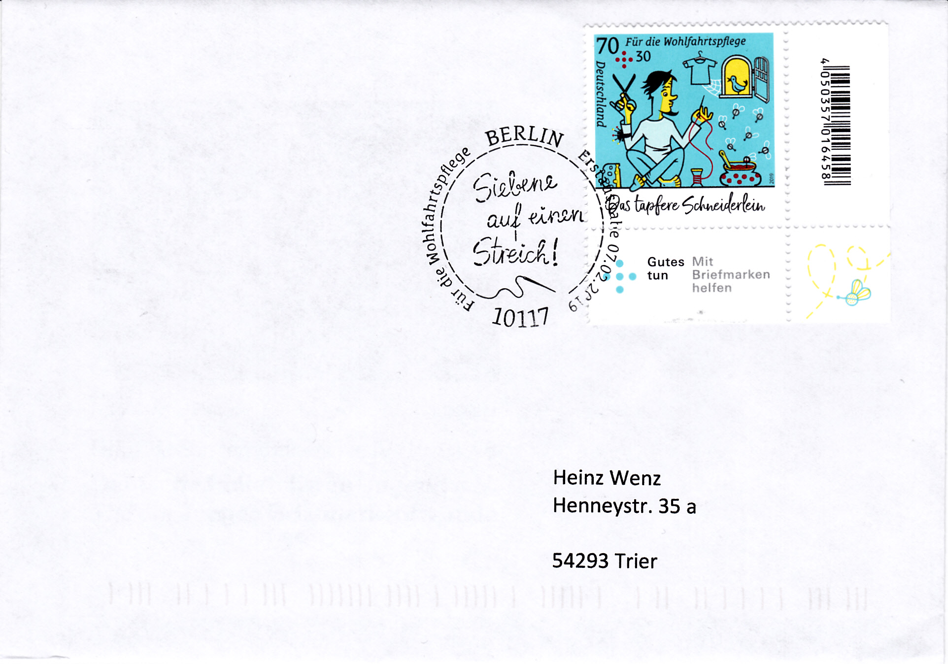 Der Ersttagsonderstempel Berlin zu dieser Markenausgabe zitiert aus dem Märchen: "Siebene auf einen Streich!". Hier der Stempel auf einem Brief mit der Marke zu 70+30 Cent (MiNr 3438).