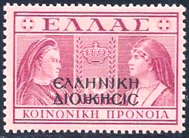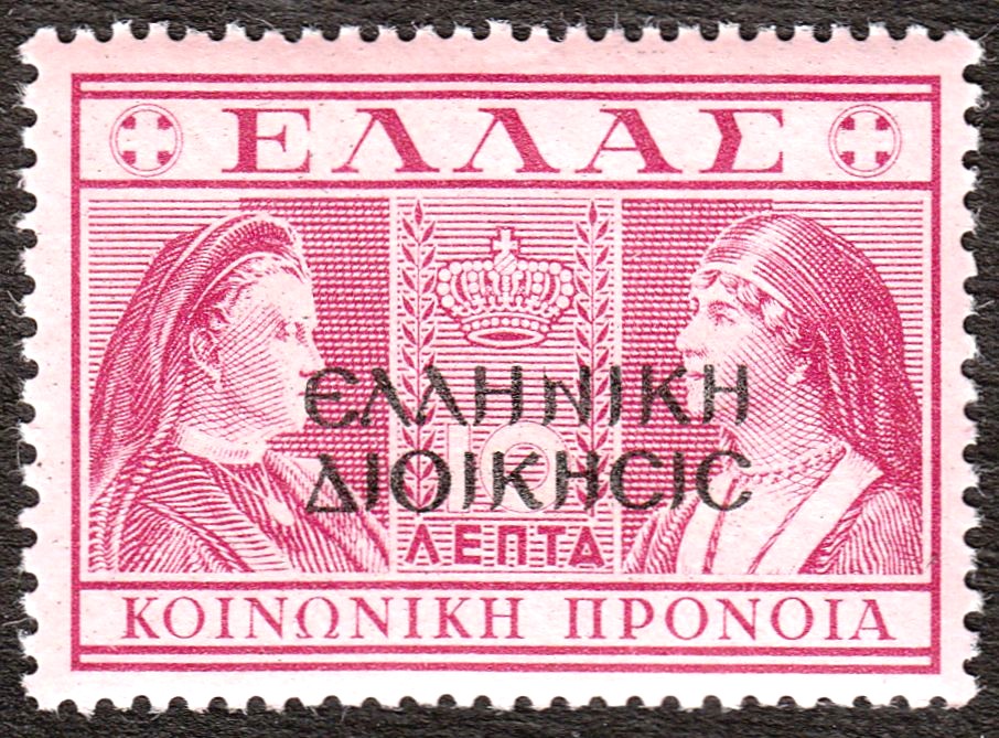 Laut den Informationen im MICHEL-Katalog erschien diese Marke am 10.12.1940, indem die griechische Zwangszuschlagsmarke MiNr. Z 62 mit einem Aufdruck in griechischen Buchstaben "Elliniki Dioikisis" versehen wurde.