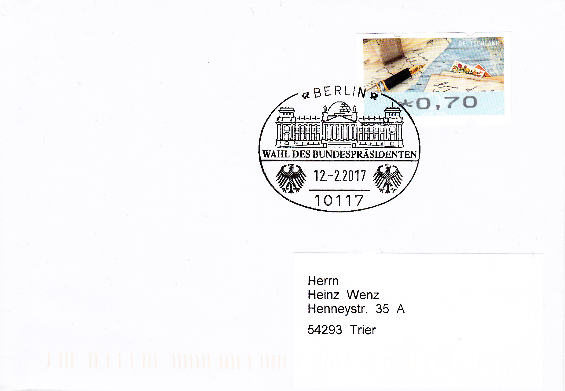 Zur Wahl des Bundespräsidenten wurde am 12.2.22017 in Berlin dieser Sonderstempel mit der Abbildung des Reichstages geführt.