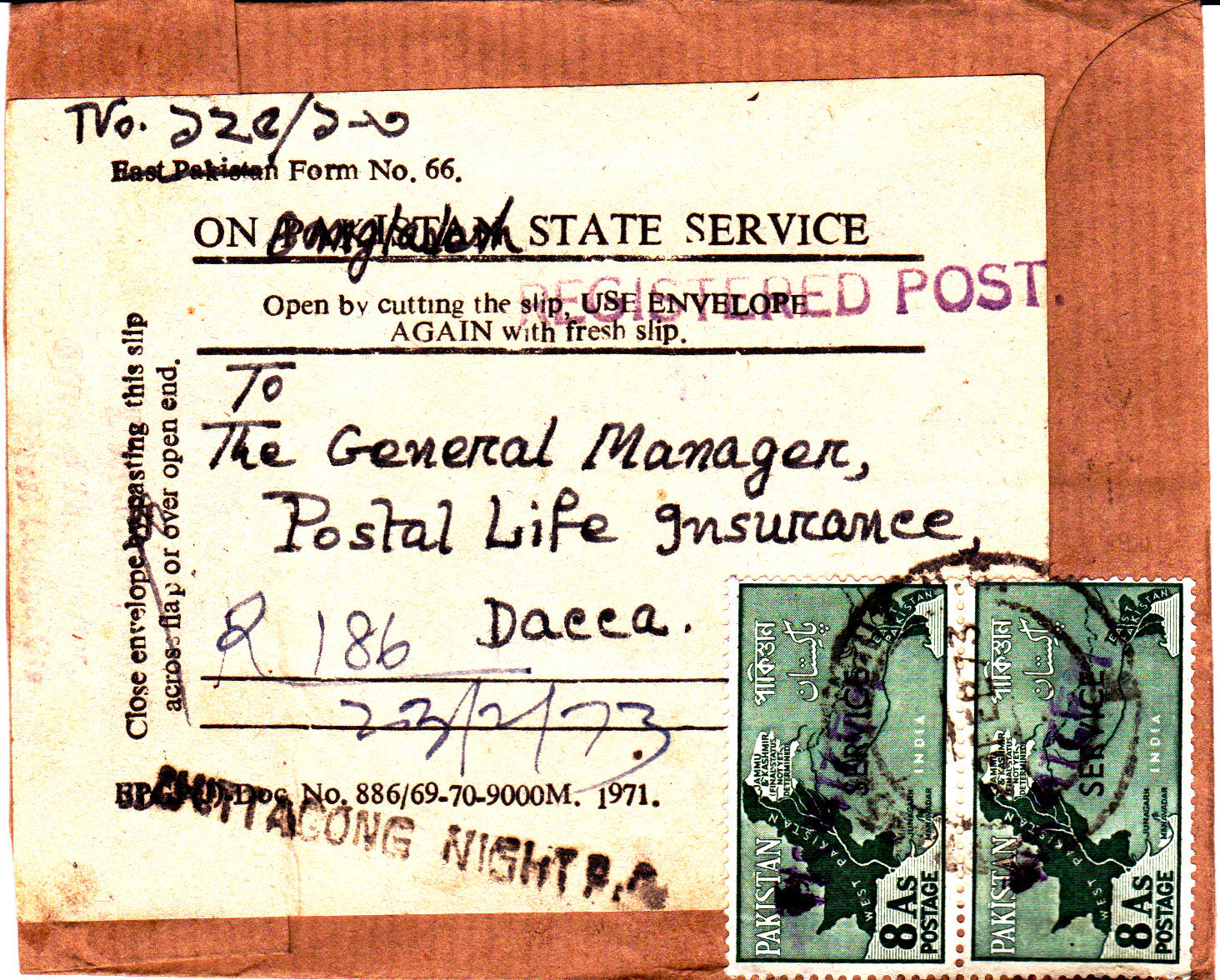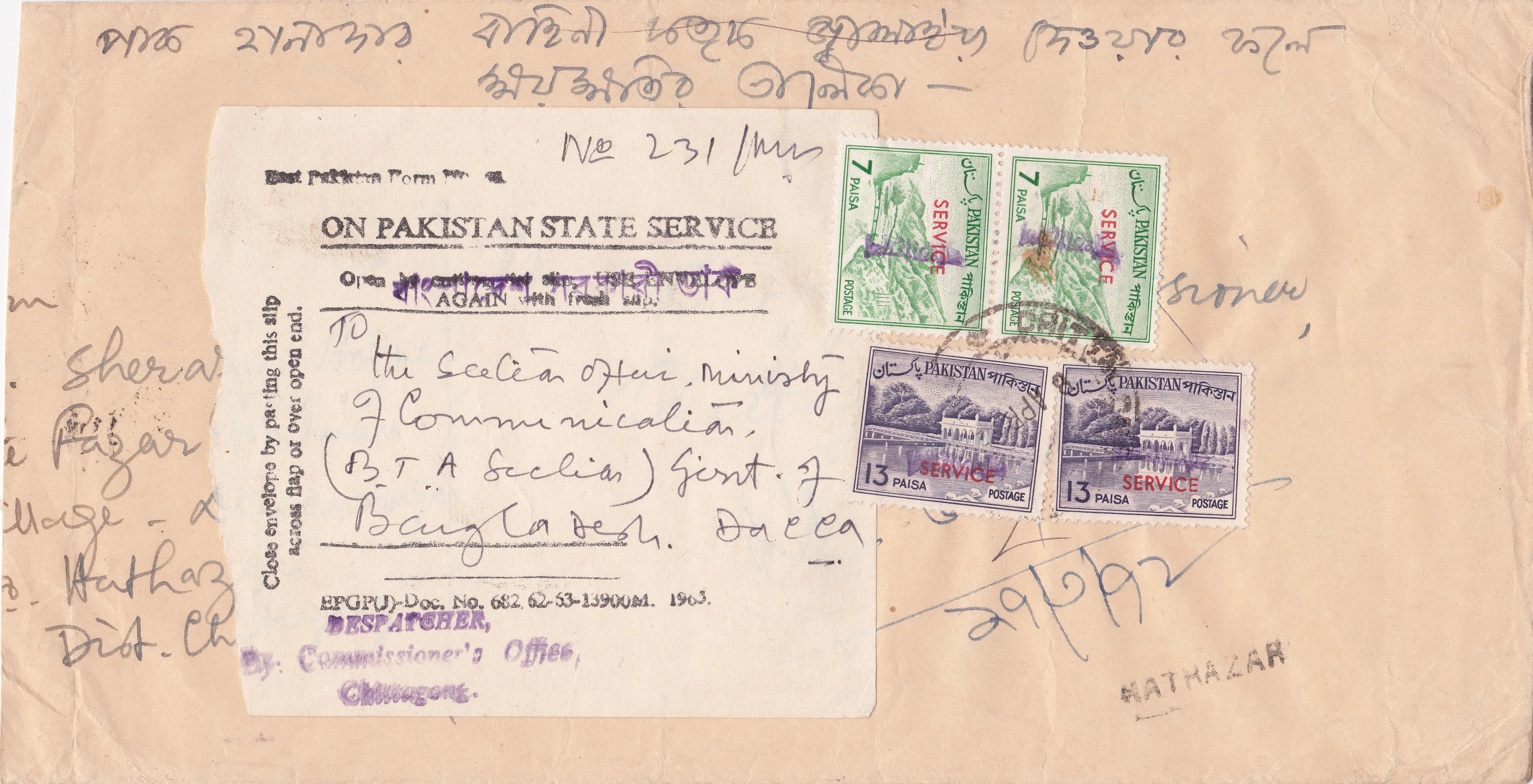 Zunächst für einen Einschreibebrief von Hathazari (District Chittagong) an den „Deputy Commissioner“ in Chittagong. Der Einschreiben Postaufgabe Stempel NATHASAR(I) ist unten rechts angebracht, die Nummer des Einschreibens ist mit den beiden 13 Paisa-Marken überklebt worden, das Datum der Aufgabe ist noch zu lesen. Die Frankatur mit zwei 50 Paisa Marken ist auf der Rückseite verklebt. Der Zustellstempel Chittagong ist auf der Rückseite abgeschlagen. Der Umschlag wurde geöffnet und wieder verwendet für einen Dienstbrief nach Dacca. Die neue Anschrift wurde auf eine Adressenfahne geschrieben und aufgeklebt. Die Frankatur zeigt zwei 7 Paisa und zwei 13 Paisa Dienstmarken (Aufdruck in rot: SERVICE) Auf der alten Fahne ist noch zu lesen ON PAKISTAN STATE SERVICE, darunter ist ein Stempel in Bengali zu sehen, der dies in Bangladesch State Service ändert. Der Zustellstempel ist auf der Rückseite zu sehen (Dacca 11.April 72)