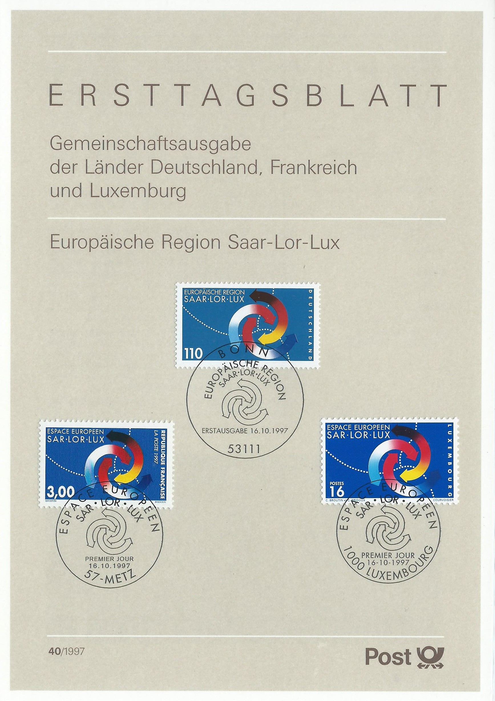 heute kann ich ein Ersttagsblatt einer Parallelausgabe zeigen: Es handelt sich um die Ausgabe Europäische Region Saar-Lor-Lux, wo die bildgleichen Marken aus Deutschland, Frankreich und Luxemburg enthalten sind. Gestempelt wurde mit den jeweiligen Ersttagsstempel der ausgebenden Länder vom 16.10.97.