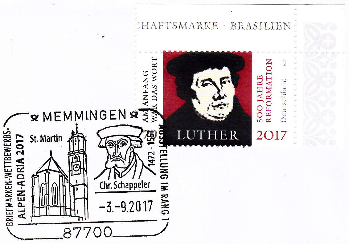 Sonderstempel vom 3.9.2017 aus Memmingen mit einem Porträt von Christoph Schappeler und der Kirche St. Martin.