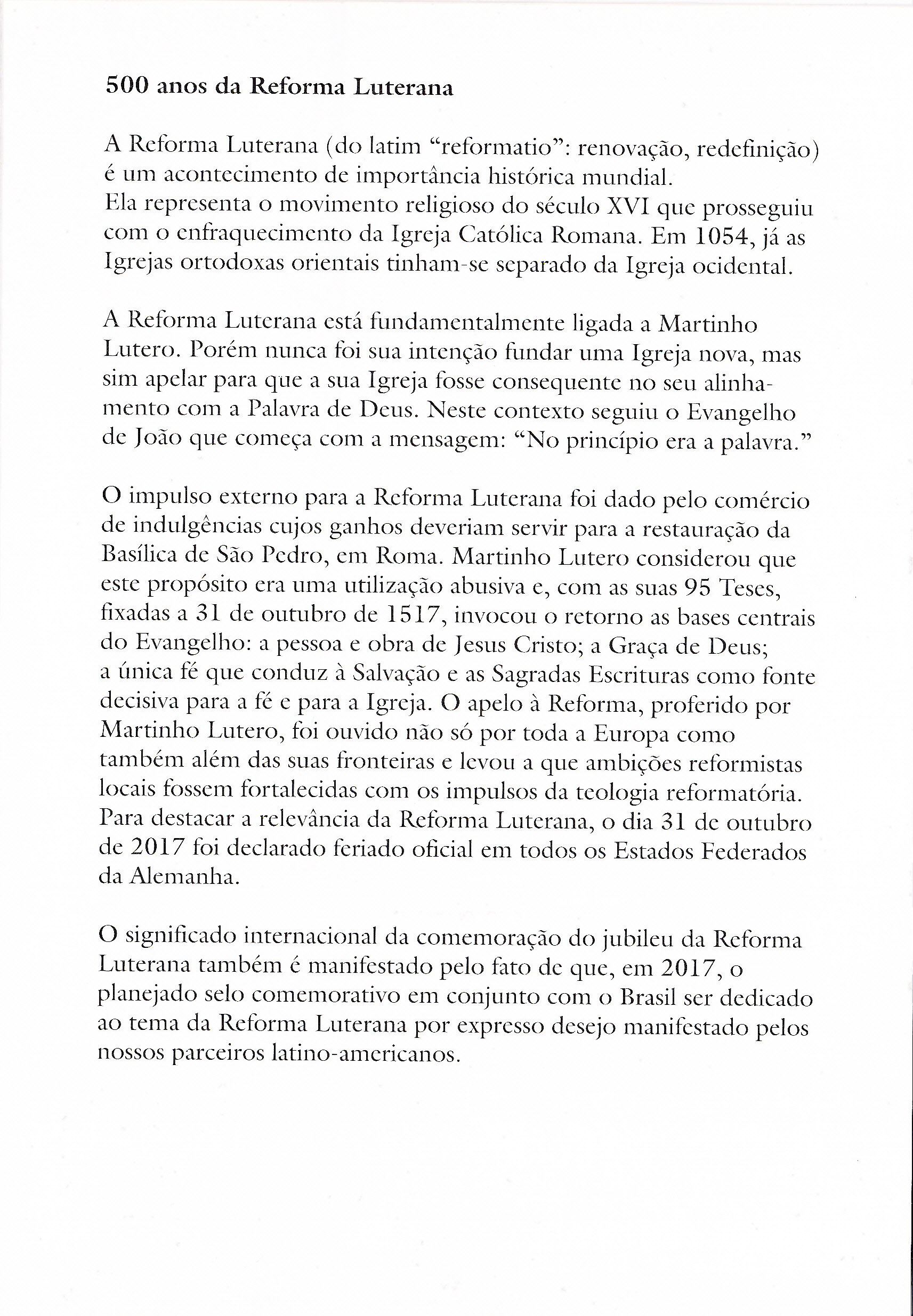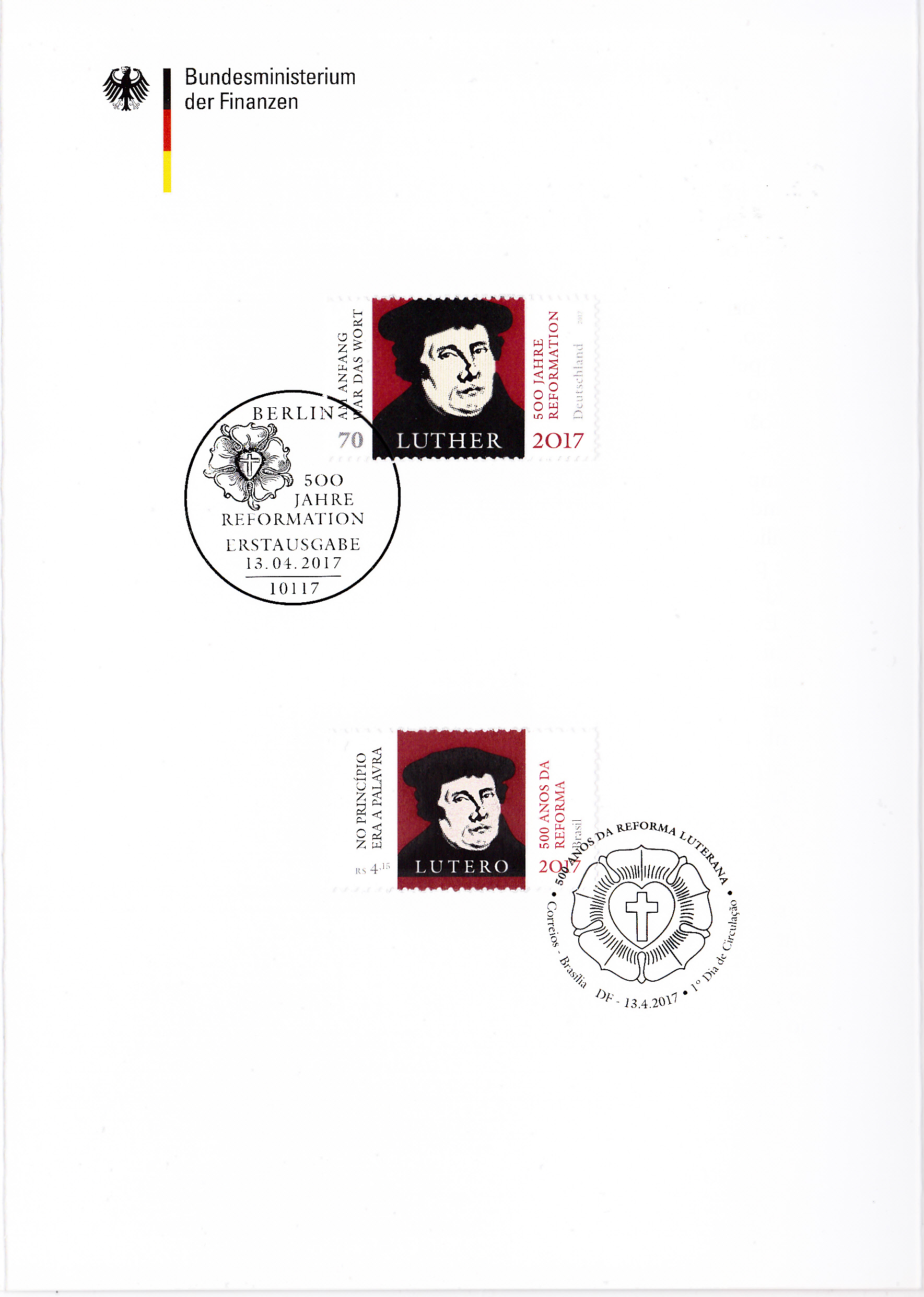Die farbige Ministerkarte zur Ausgabe "500 Jahre Reformation" besteht aus sechs Seiten im Format A5 und enthält auch die Marke der Parallelausgabe aus Brasilien.