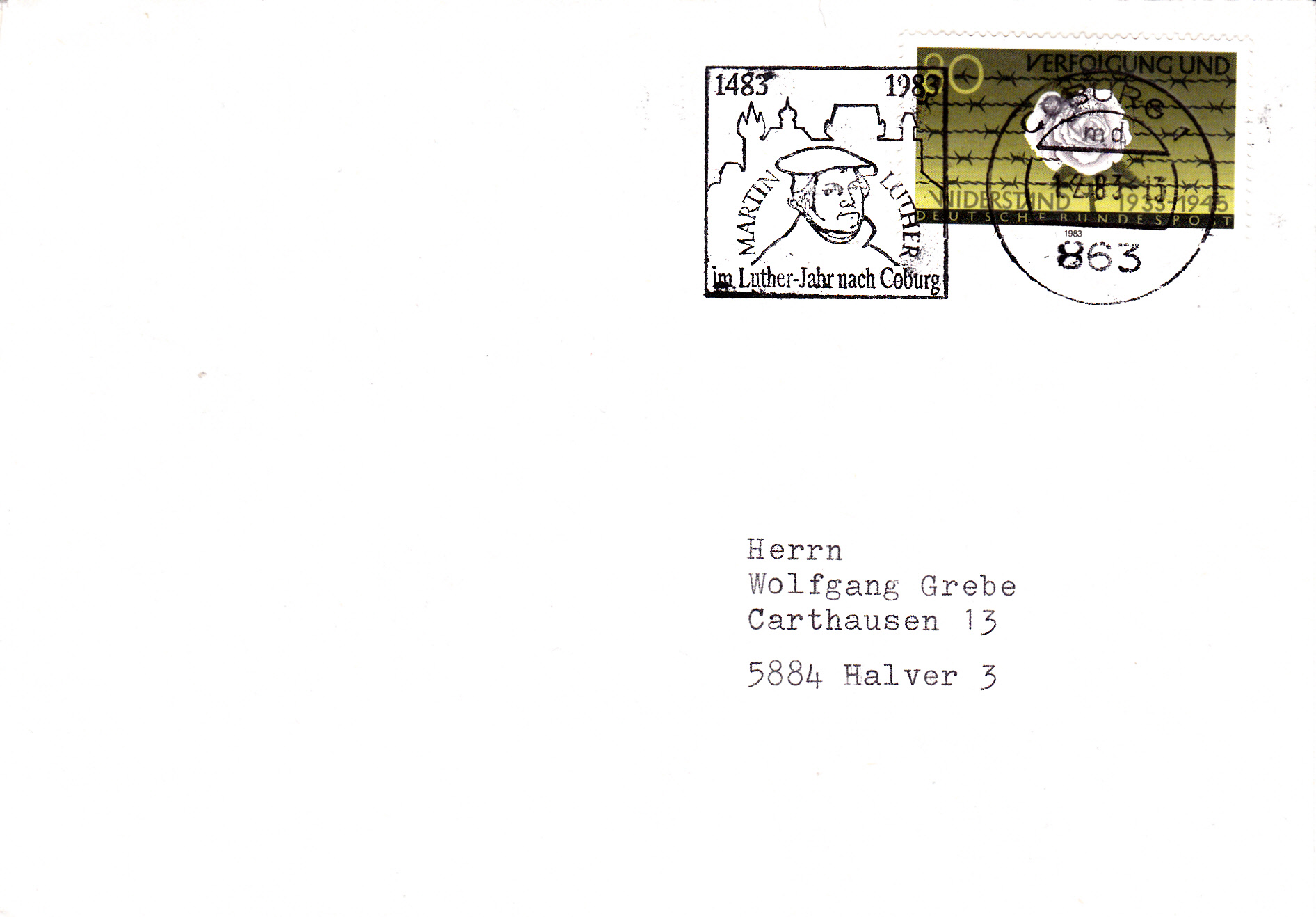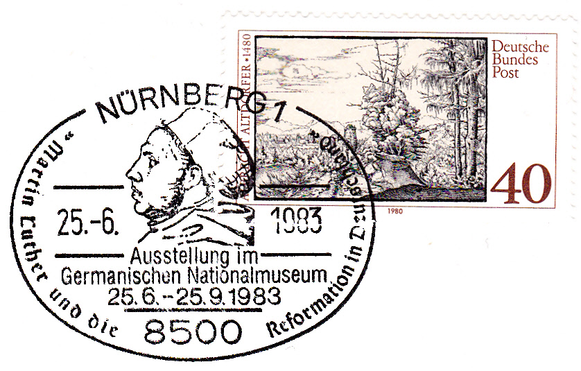 In diesem Sonderstempel vom 25.6.1983 aus Nürnberg zu einer Ausstellung "Martin Luther und die Reformation in Deutschland" zeigt eines der bekannten Lutherporträts.