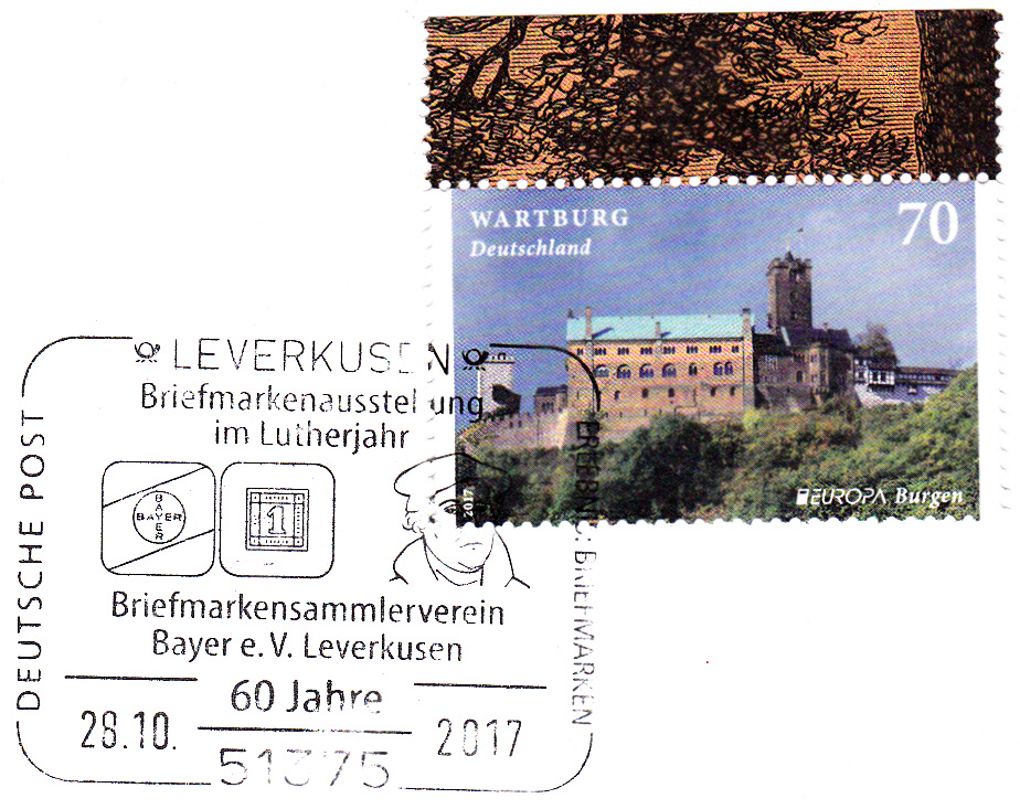 Im Sonderstempel aus Wittenberg vom 31.10.2016 wird links Luther als Augustinermönch und rechts ein Porträt des Ablasspredigers Johannes Tetzel gezeigt.