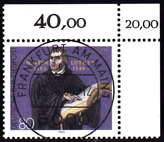 Dieses Eckrandstück der bereits gezeigten Marke zum 500. Geburtstag von Martin Luther der Deutschen Bundespost 1983 (MiNr 1193) mit Vollstempel hat eine korrigierte Bogenwertzahl.