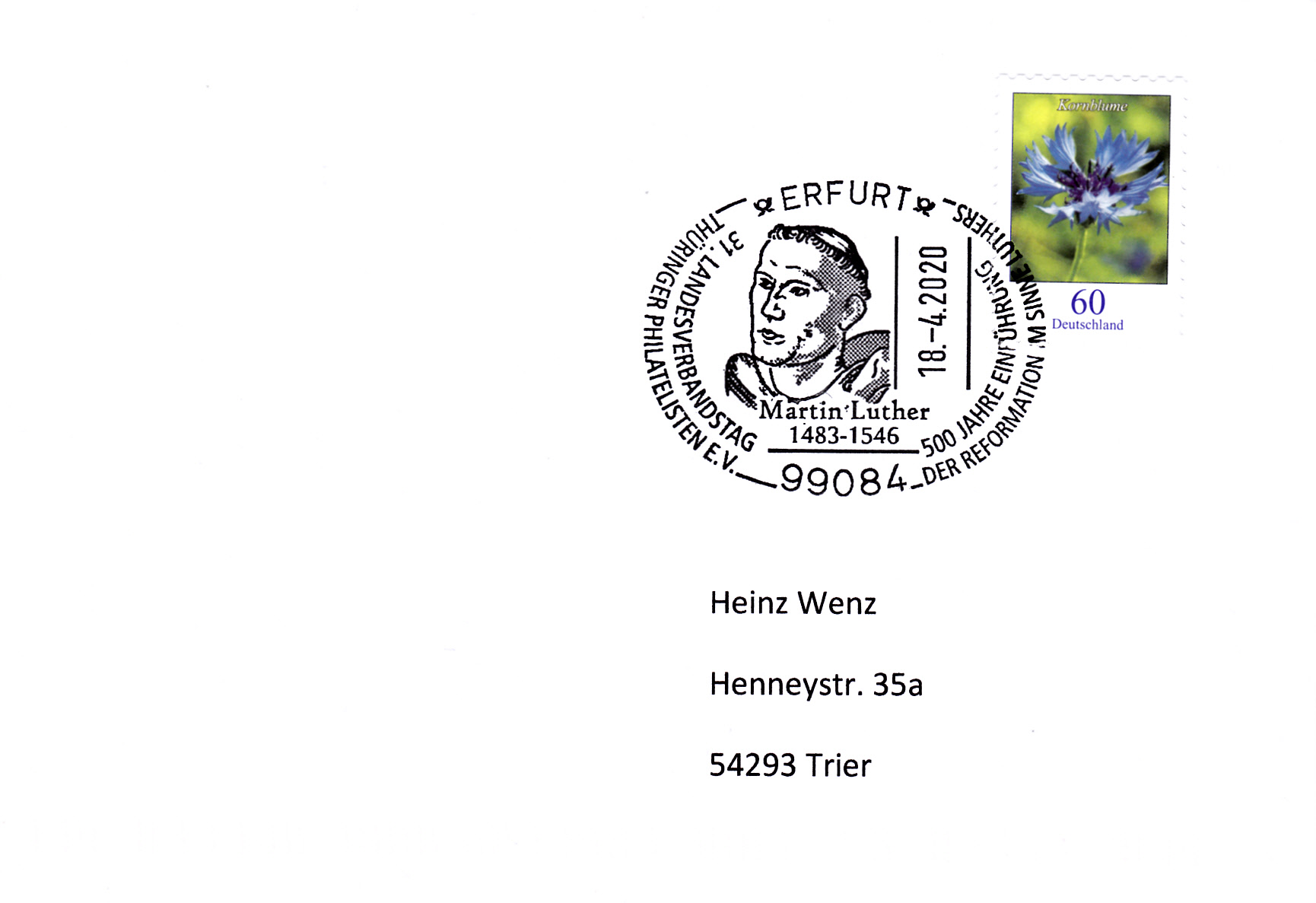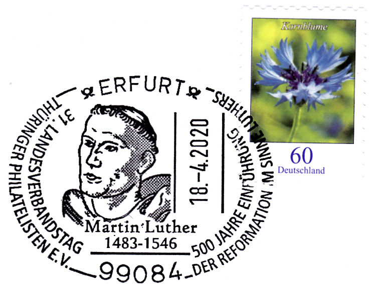 Dieser Sonderstempel vom 18.4.2020 aus Erfurt mit einem Porträt von Martin Luther nimmt Bezug auf diese Schriften von Martin Luther.