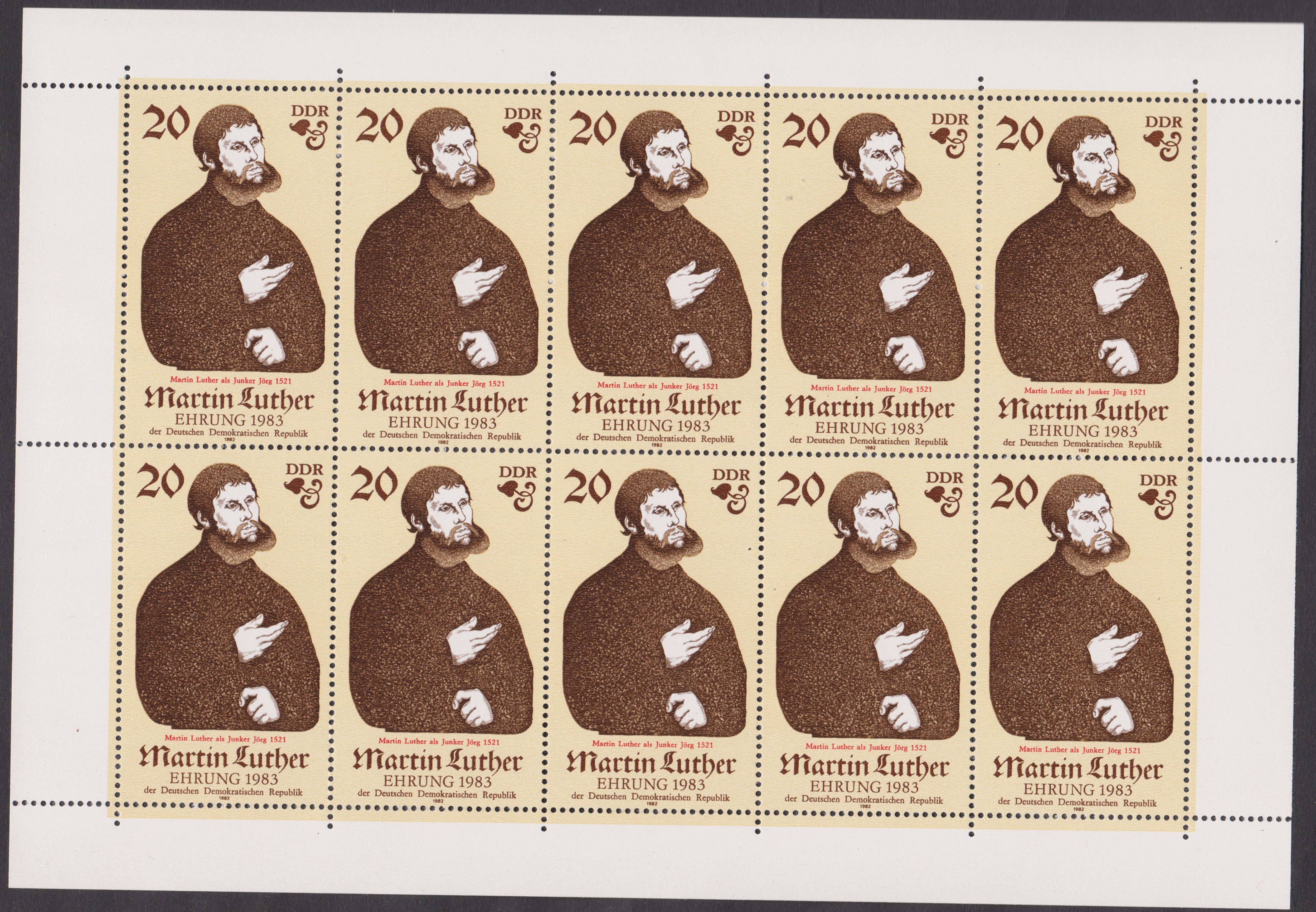 Kleinbogen der Marke zu 20 Pf (DDR MiNr. 2755), die Martin Luther als Junker Jörg zeigt nach einem Gemälde von Lucas Cranach d. Ä. (1472-1538, Maler und Zeichner):