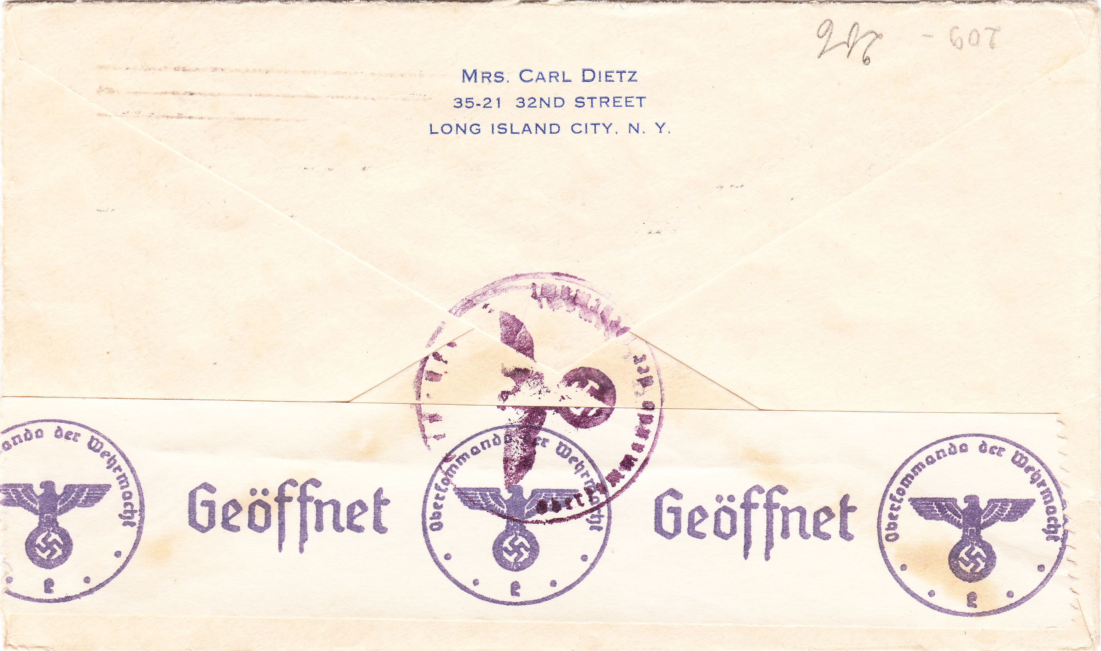 http://www.italianliners.com/conte-di-savoiaitIn Europa angekommen wurde der Beeleg der für die Prüfung von Post aus den USA ins Deutsche Reich zuständigen ABP Frankfurt zugeleitet. Hier wurde der Beleg rückseitig geöffnet und nach erfolgter Prüfung mit einem 30 mm breiten Verschlußstreifen mit Kennbuchstabe "e" wieder verschlossen. Dieser Verschlußstreifen kam von der Rolle und wurde mit einem zickzackförmigen Hilfsgerät getrennt. Laut Landsmann ist dieser Verschlußstreifen ab März 1940 dokumentiert und wurde katalogisiert als Landsmann EV3.3.