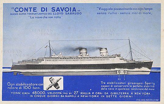 Die Conte di Savoia war ein italienisches Atlantik-Linienschiff mit einer Kapazität von 2200 Passagieren. Die Conte di Savoia, benannt nach dem Haus Savoyen, wurde ursprünglich von der Reederei Lloyd Sabaudo-Line in Auftrag gegeben, welche allerdings noch in der Bauzeit in der Italia Flotte Riunite aufging. Das Schiff wurde auf der Werft Cantieri Riuniti dell'Adriatico in Triest gebaut und lief 1932 vom Stapel. Sie war bauähnlich der ebenfalls von der Italia Flotte Riunite betriebenen Rex. Bereits auf ihrer Jungfernfahrt von Genua nach New York trat bei dem Schiff ein Leck unterhalb der Wasserlinie auf, das aber schnell wieder geschlossen werden konnte. Bis 1940 war die Conte di Savoia im Dienst der Linie. Im Anschluss wurde sie als Truppentransporter im Zweiten Weltkrieg eingesetzt und bei einem Luftangriff am 11. September 1943 versenkt. 1945 wurde sie wieder gehoben und 1950 schließlich verschrottet.