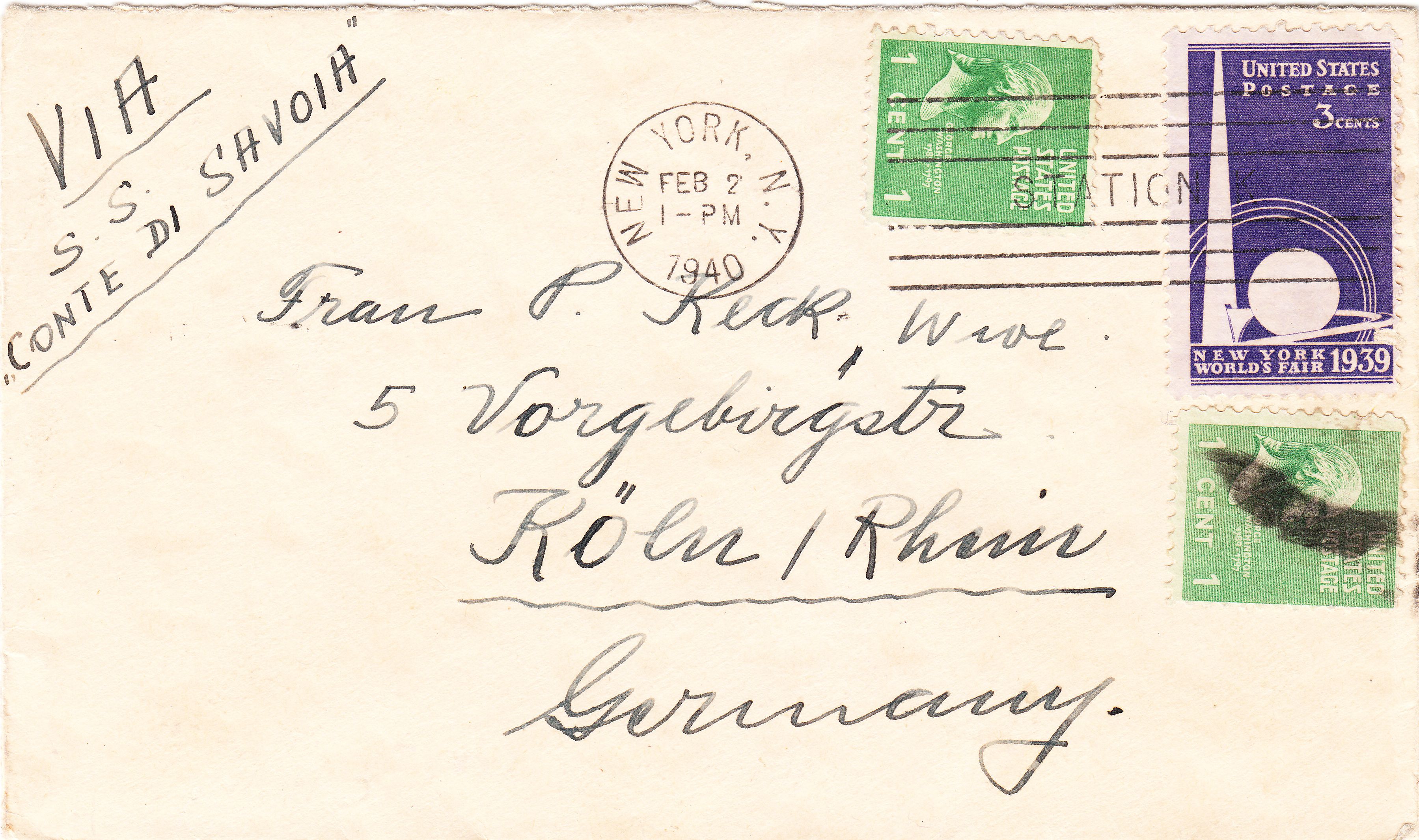 Der am 02.02.1940 in New York "STATION K" aufgegebene Beleg trägt einen handschriftlichen Vermerk "VIA S.S. "CONTE DI SAVOIA" und wurde somit per Schiff von New York nach Europa befördert.