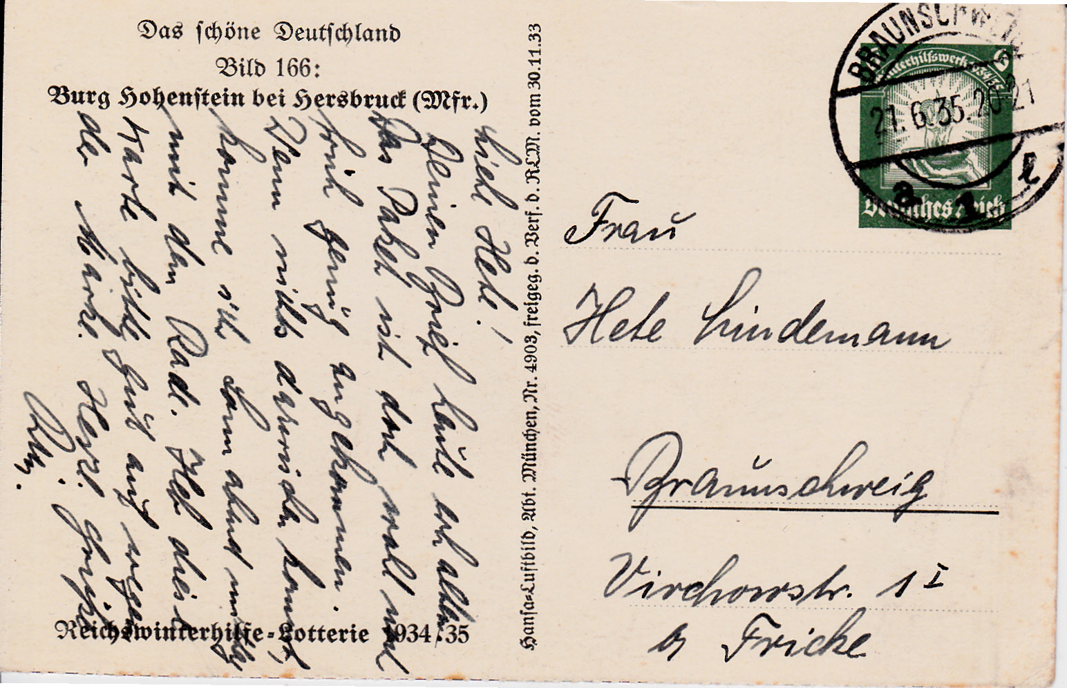 Die Sonderpostkarte für das Winterhilfswerk P 254 Bild 66 bildet auf der Bildseite der Karte Burg Hohenstein ab.
