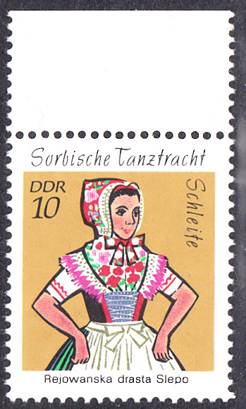 Auf einer der beiden Werte zu 8ß+40Pf (MiNr 1696) wird eine Tracht von Rügen (Mecklenburg-Vorpommern) vorgestellt. Hier halten die beiden Personen sogar noch je eine Kopfbedeckung in ihren Händen.