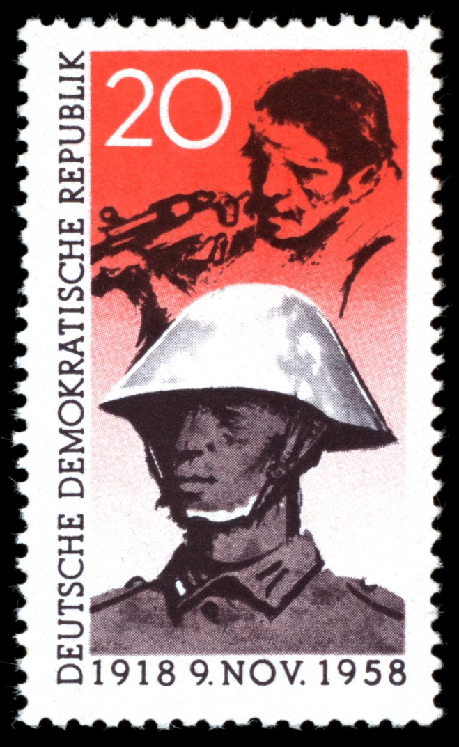 Hier als erstes Beispiel die am 07.11.1958 erschienene MiNr. 662 der DDR, die einen Soldaten der Nationalen Volksarmee mit seinem ballistischen Schutzhelm zeigt: