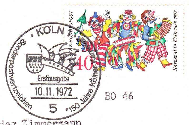 Im Ersttagsonderstempel aus Köln zur Markenausgabe "150 Jahre Kölner Karneval" wird eine typische Narrenkappe im Stempelbild gezeigt.