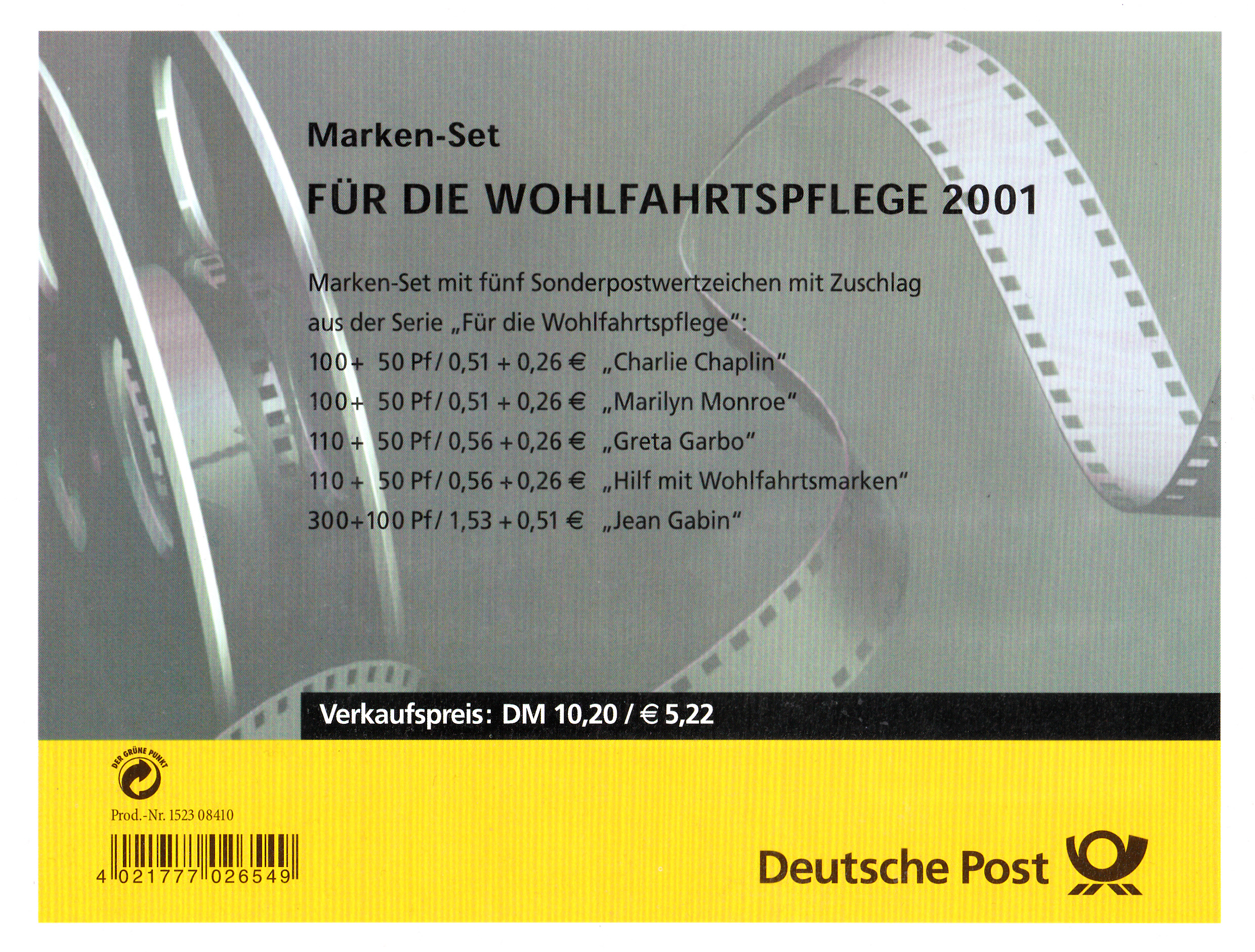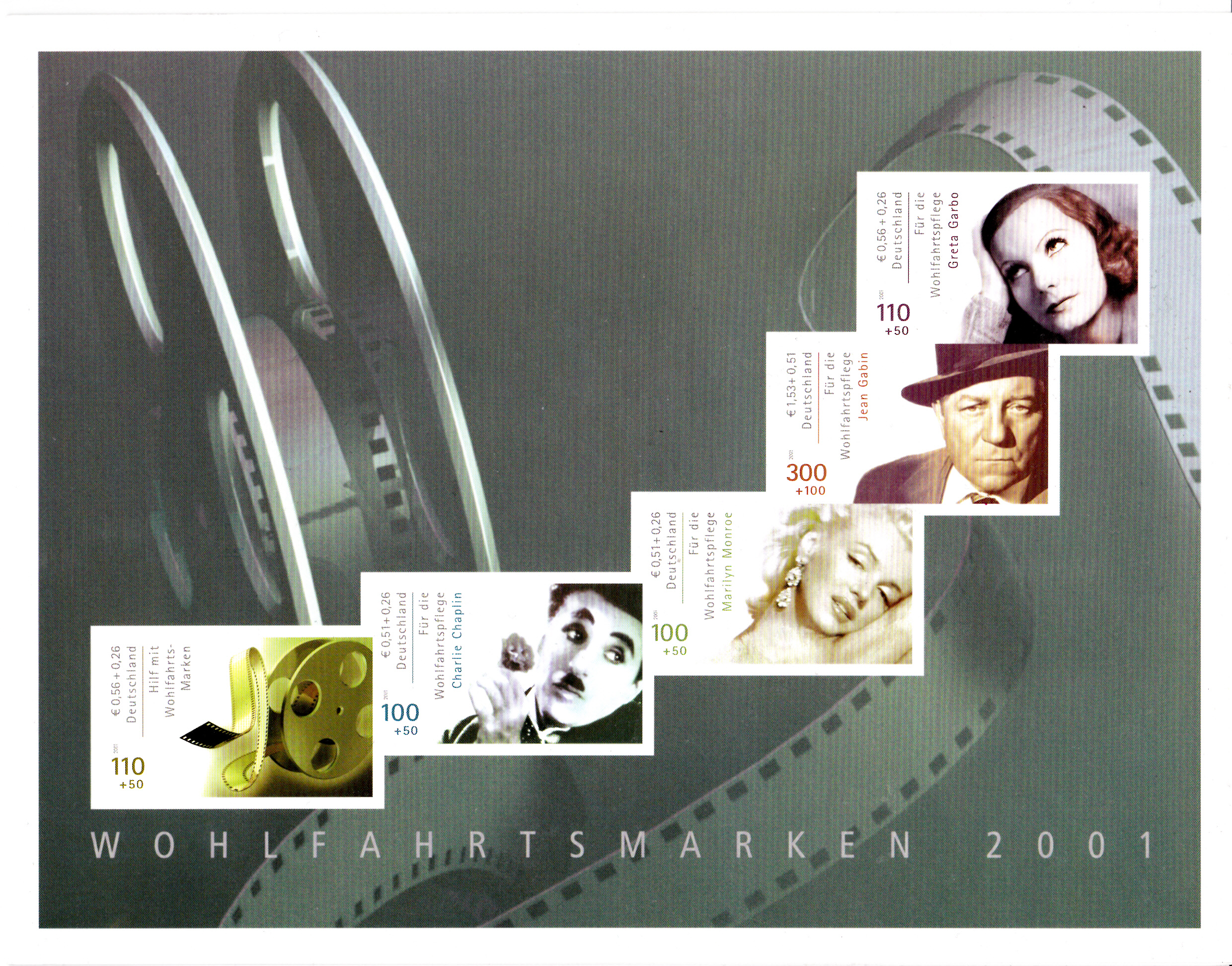 Die Wohlfahrtsmarke der Deutschen Post zu 200+100Pf aus dem Jahre 2001 (MiNr 2222) zeigt den Filmschauspieler Jean Gabin mit einem Homburger Hut.