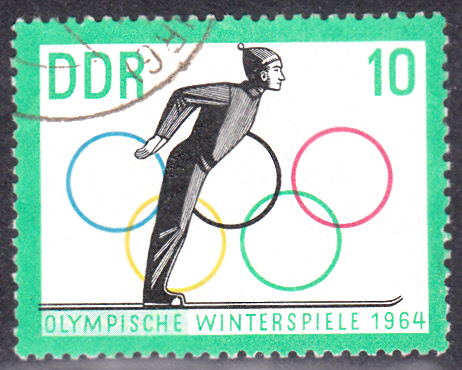 Beim Skispringen hat man bis in die 1960er-Jahre Strickmützen getragen. Hier auf dieser Marke der DDR (MiNr 1000) sieht man einen Skispringer in der Anlaufspur mit einer gestrickten Zipfelmütze.
