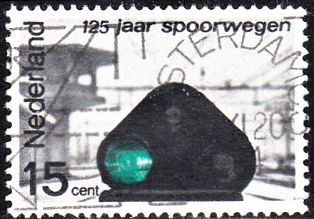 Auf dieser Marke aus den Niederlande (MiNr 824) sehen wir ein Zwergsignal aus den Niederlande. Grünes Licht bei einem Zwergsignal bedeutet in den Niederlande "Vorbeifahrt mit maximal 40 km/h". Nach den mir vorliegenden Bildern sollte aber grün oben leuchten und nicht links. Links ist für "Rot" vorgesehen.