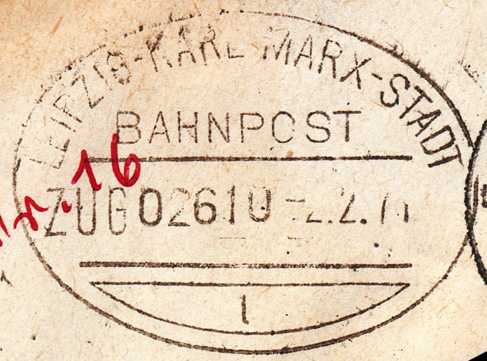 Auf der Rückseite findet sich ein Bahnpoststempel "LEIPZIG - KARL-MARX-STADT ZUG 02610":