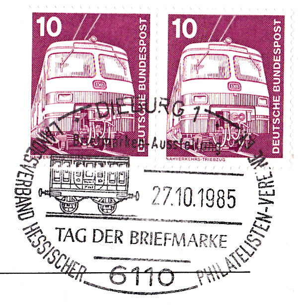 In diesem Sonderstempel vom 27.10.1985 aus Dieburg zum Tag der Briefmarke wird ein Bahnpostwagen gezeigt.