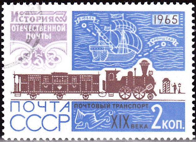 Auf dem Blockrand dieses Blockes der Sowjetunion (MiNr Block 193) ist ein Zug abgebildet mit einem Bahnpostwagen.