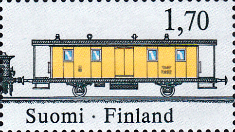 Aus Finnland kommt diese Marke (MiNr 1018) mit einer Abbildung des Bahnpostwagen Nr. 9935.