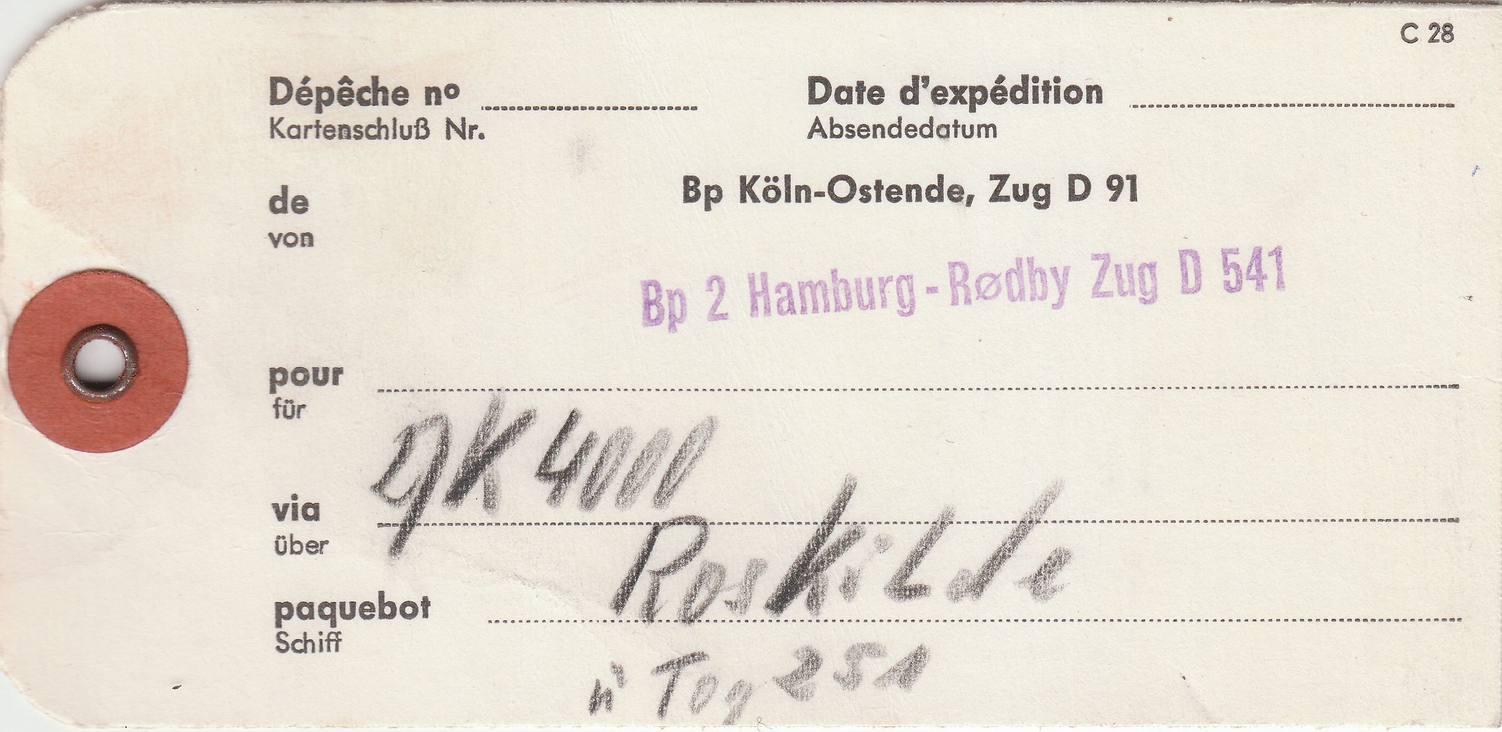 Bahnpostbeutelanhänger der Bahnpost Köln - Ostende und Retour, zur Übergabe an die Bahnpost Hamburg - Rödby nach Roskilde in Dänmark.