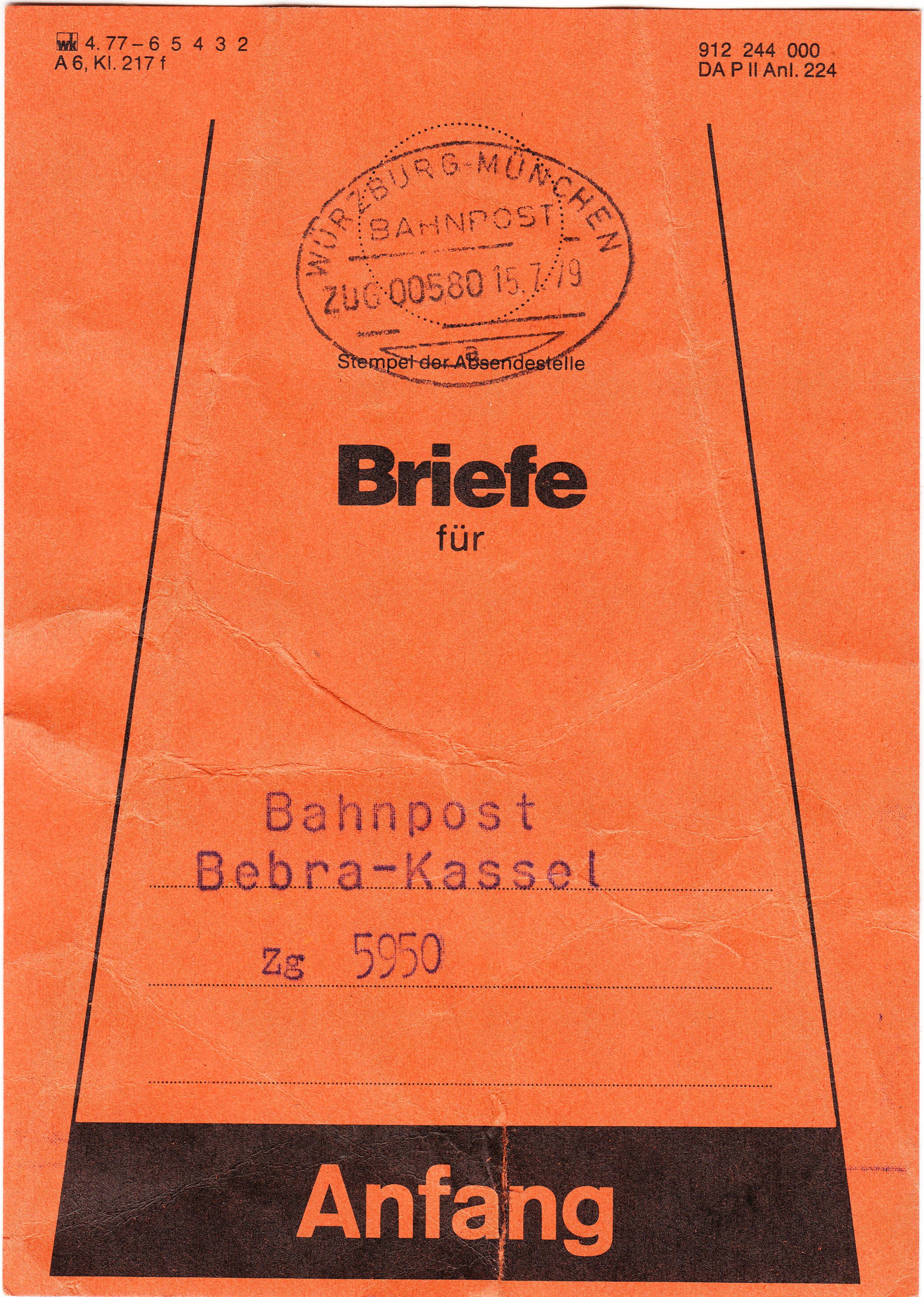 Hier eine am 15.07.1979 bei der Bahnpost im "ZUG 00580" auf der Strecke Würzburg-München eingesetzte Beutelfahne für Briefe, die für einen Beutel an die "Bahnpost Bebra-Kassel", Zug 5950 bestimmt waren: