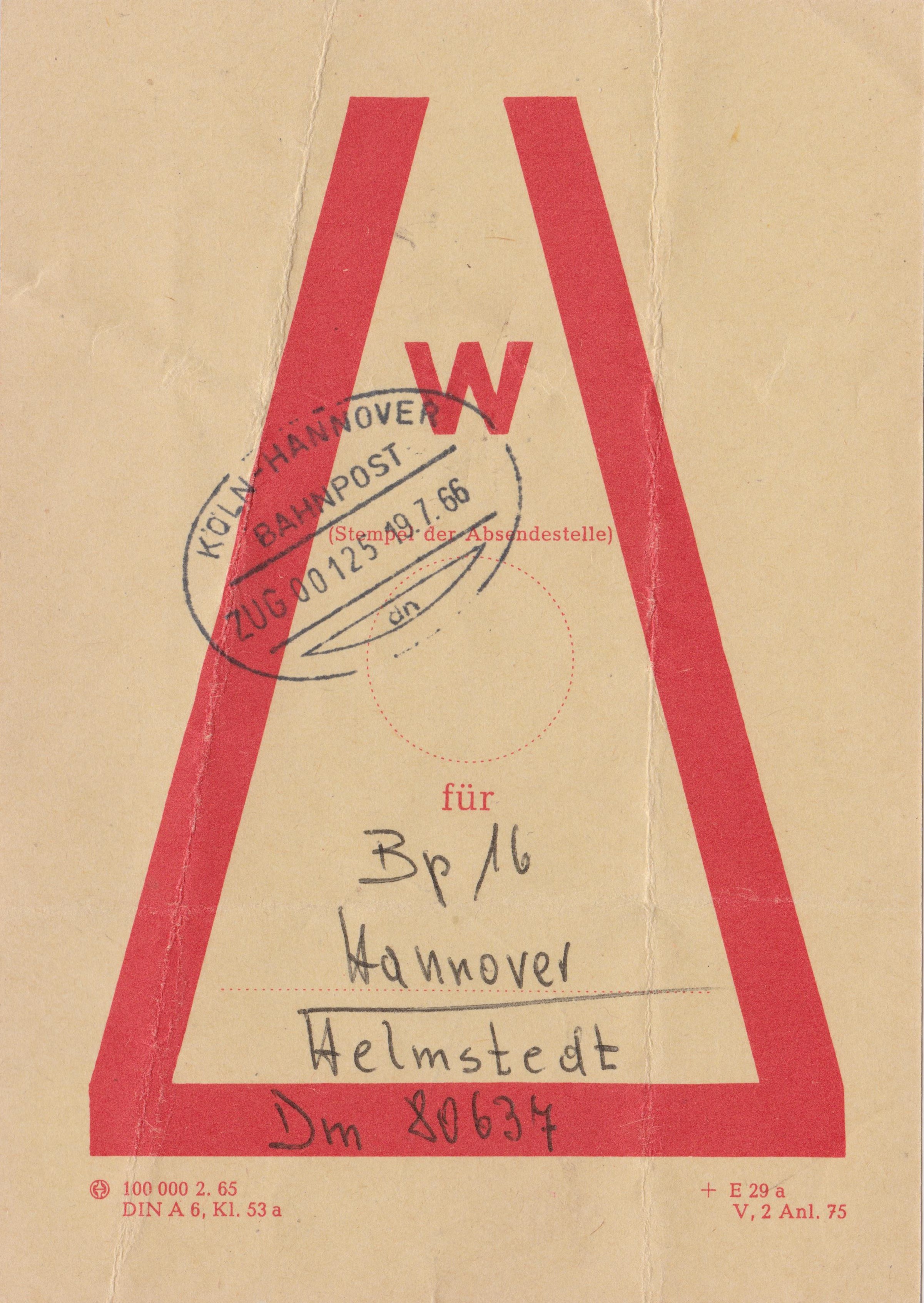 Beutelfahne "W" (das "W" steht für "Wertbriefe"), gedruckt im Februar 1965 in einer Auflage von 100 000 Stück, verwendet am 19.07.1966 in "ZUG 00125" auf der Strecke "KÖLN-HANNOVER" für einen Beutel für "Bp 16 Hannover Helmstedt Dm 80637":