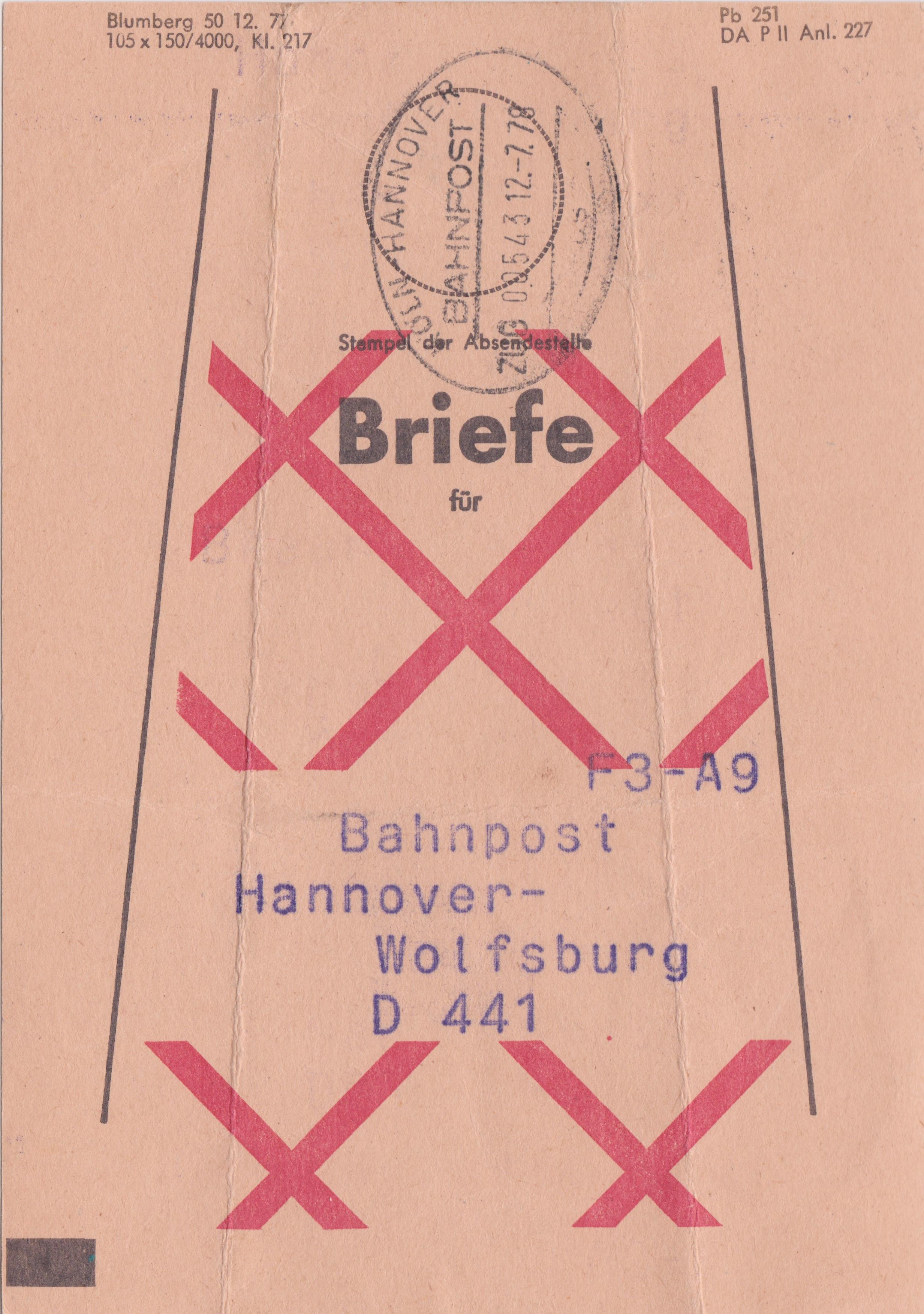 Beutelfahne mit Druckvermerk "Blumberg 12.77", gedruckt in einer Auflage von 4000 Stück, verwendet am 12.07.1978 in "ZUG 00543" auf der Strecke "KÖLN-HANNOVER" für einen Beutel "Bahnpost Hannover-Wolfsburg D 441":