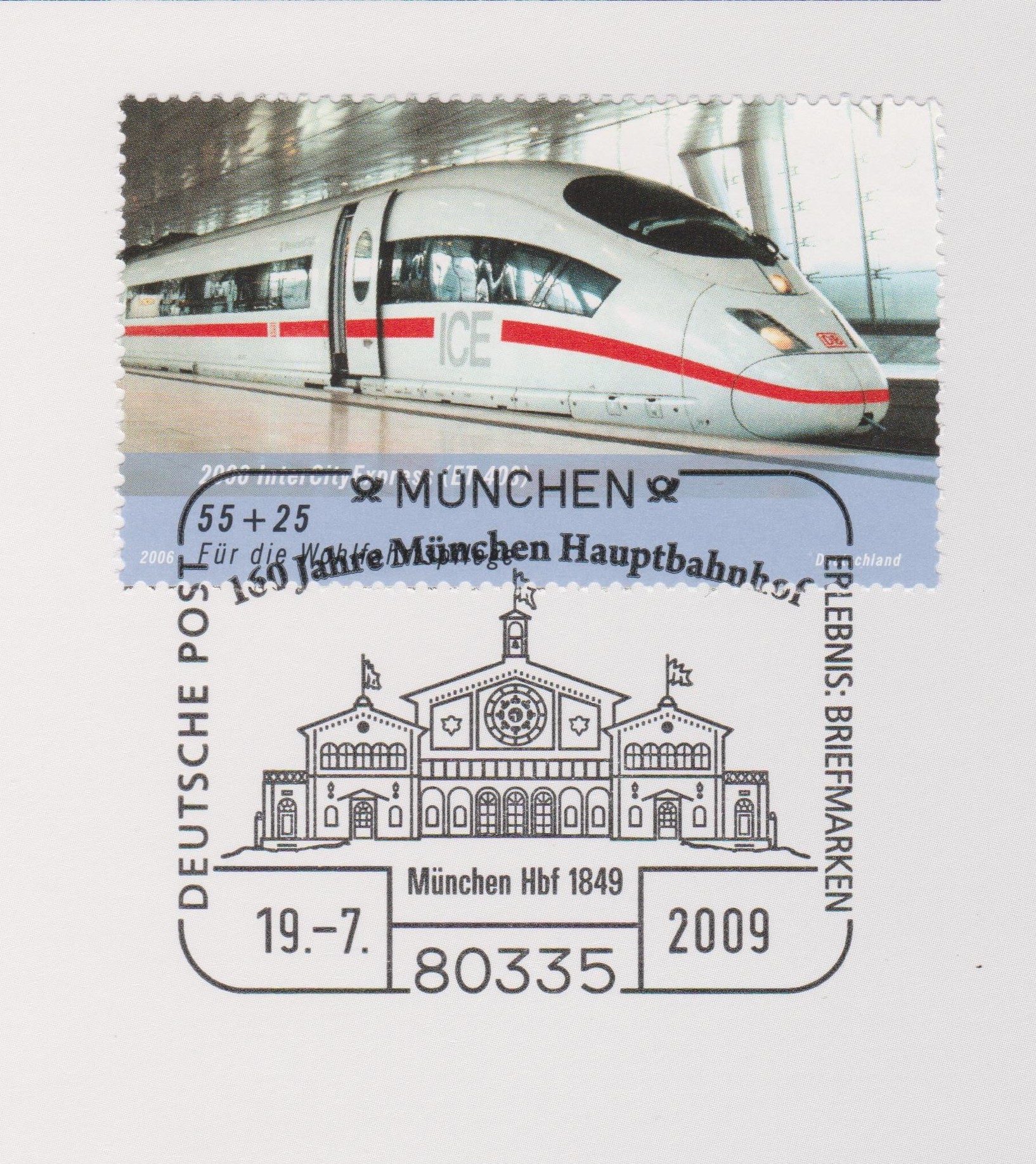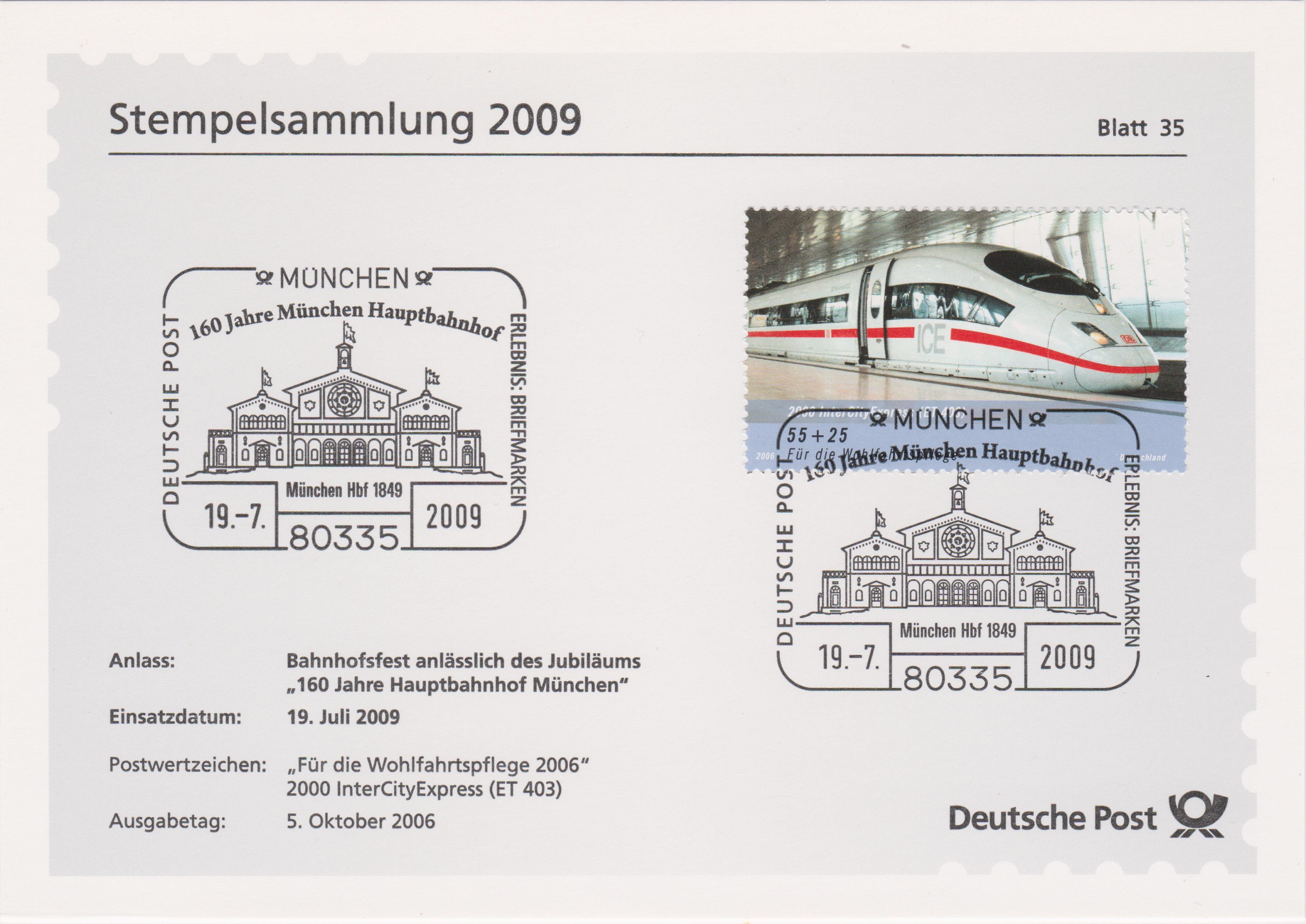 Blatt 35 der Deutsche Post Stempelsammlung 2009 zeigt einen Sonderstempel vom 19.07.2009 "160 Jahre Hauptbahnhof München" mit einer Ansicht "München Hbf 1849":